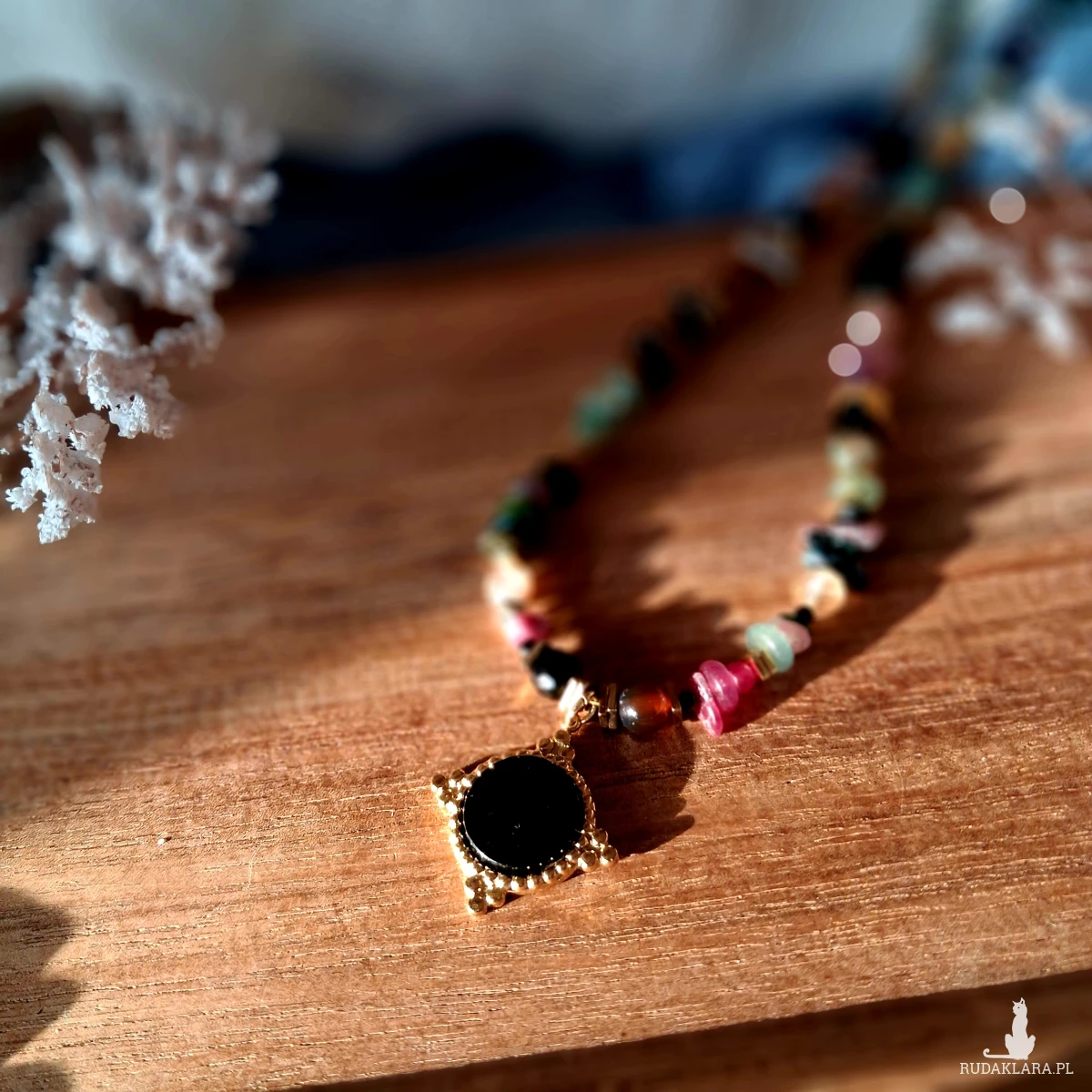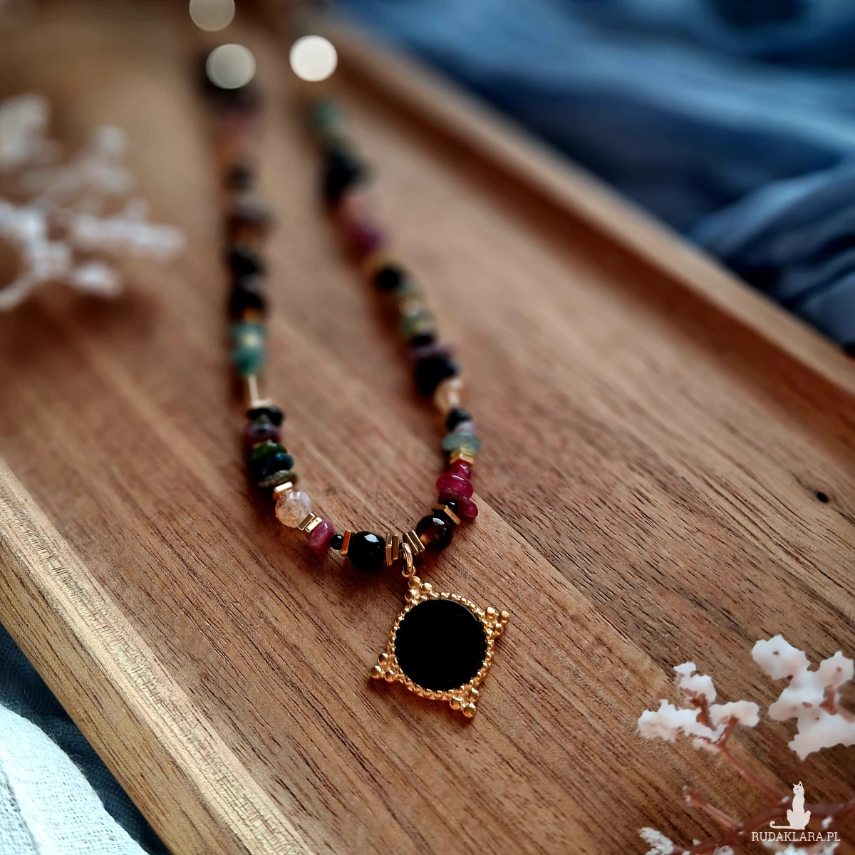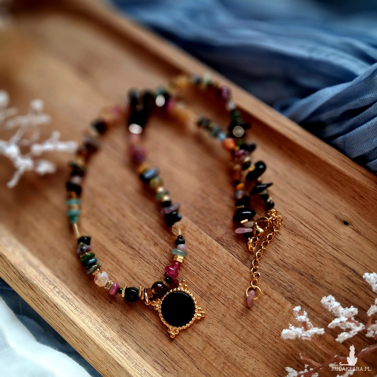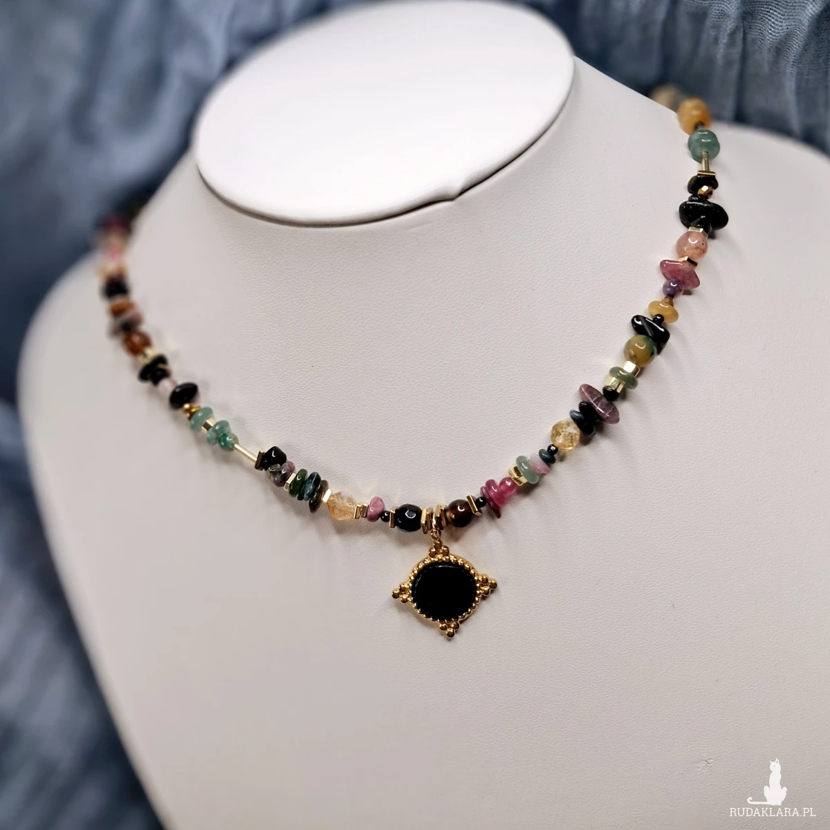 Naszyjnik wykonany z kamieni, szklanych koralików oraz stali nierdzewnej (jubilerskiej). Użyte kamienie: