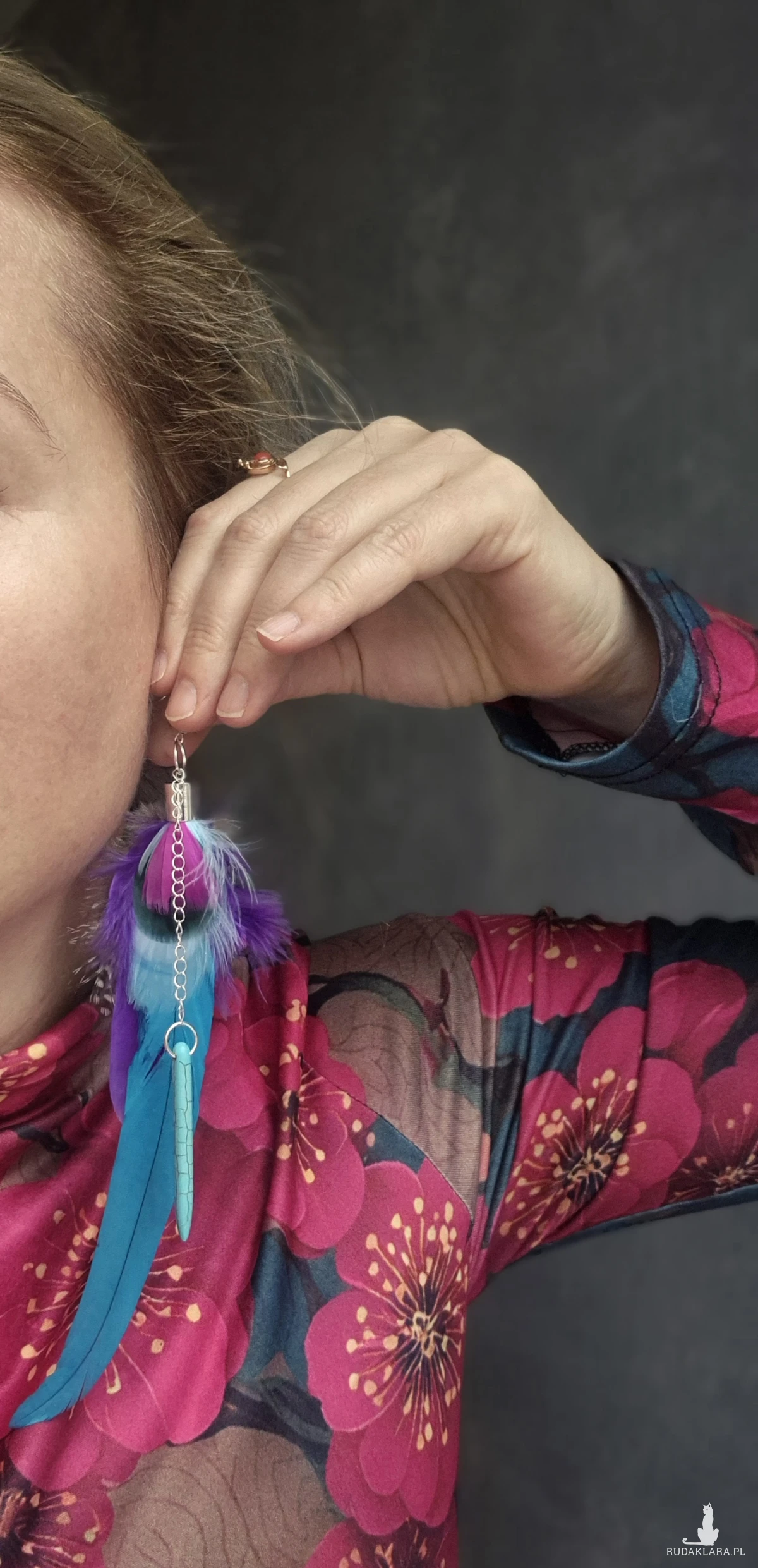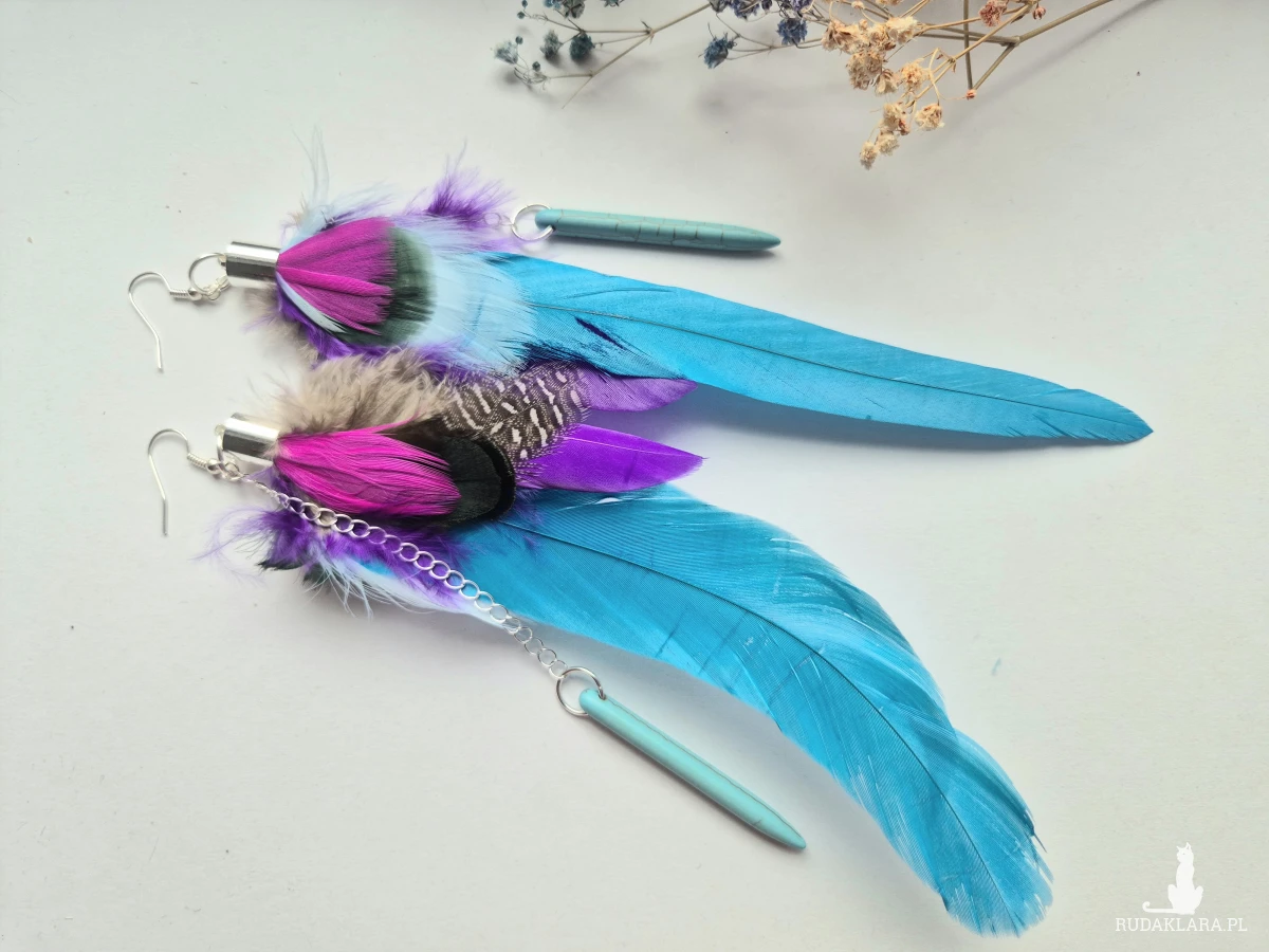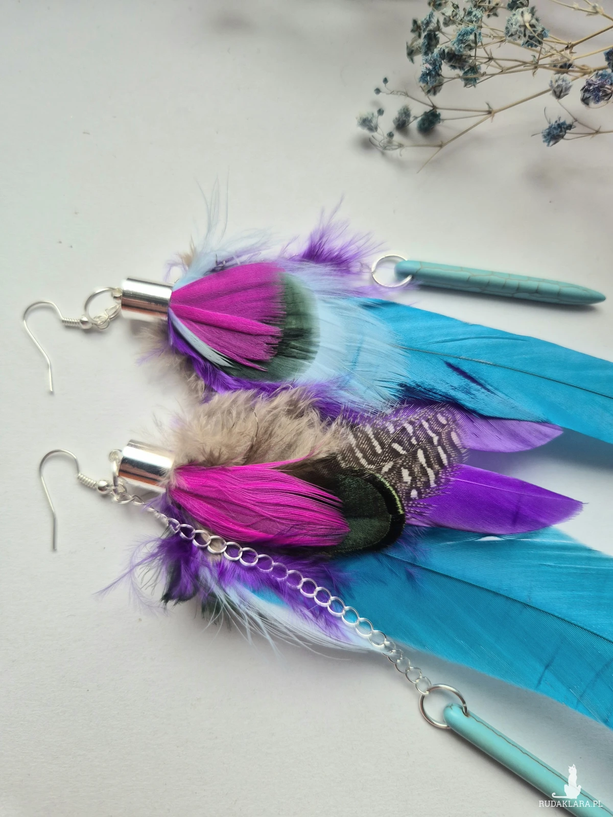 Kolczyki kolorowe energetyczne  pióra duże lekkie wykonane w pojedynczym egzemplarzu rękodzieło