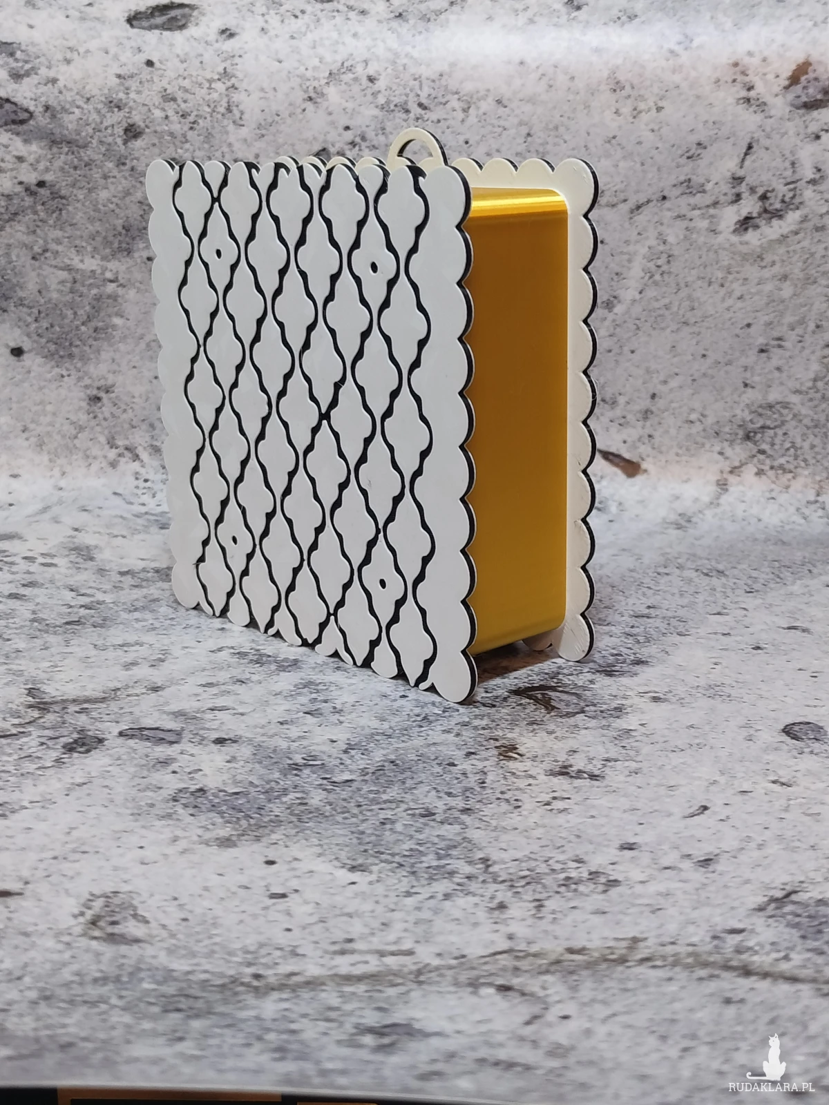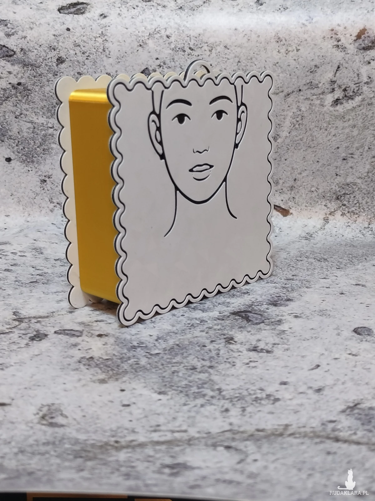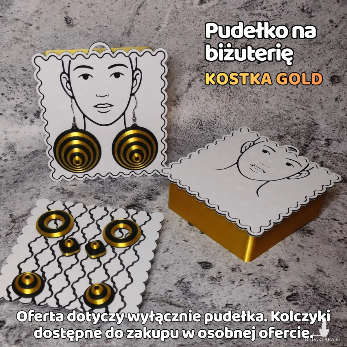 Pudełko wyposażone w magnesy ułatwiające zamkniecie. Pudełko można postawić lub powiesić. Z jednej strony są otwory na kolczyki wiszące a na drugiej na 3 pary kolczyków ze sztyftem.
