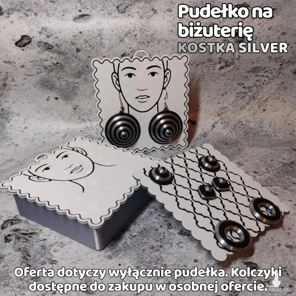 Pudełko wyposażone w magnesy ułatwiające zamkniecie. Pudełko można postawić lub powiesić. Z jednej strony są otwory na kolczyki wiszące a na drugiej na 3 pary kolczyków ze sztyftem.