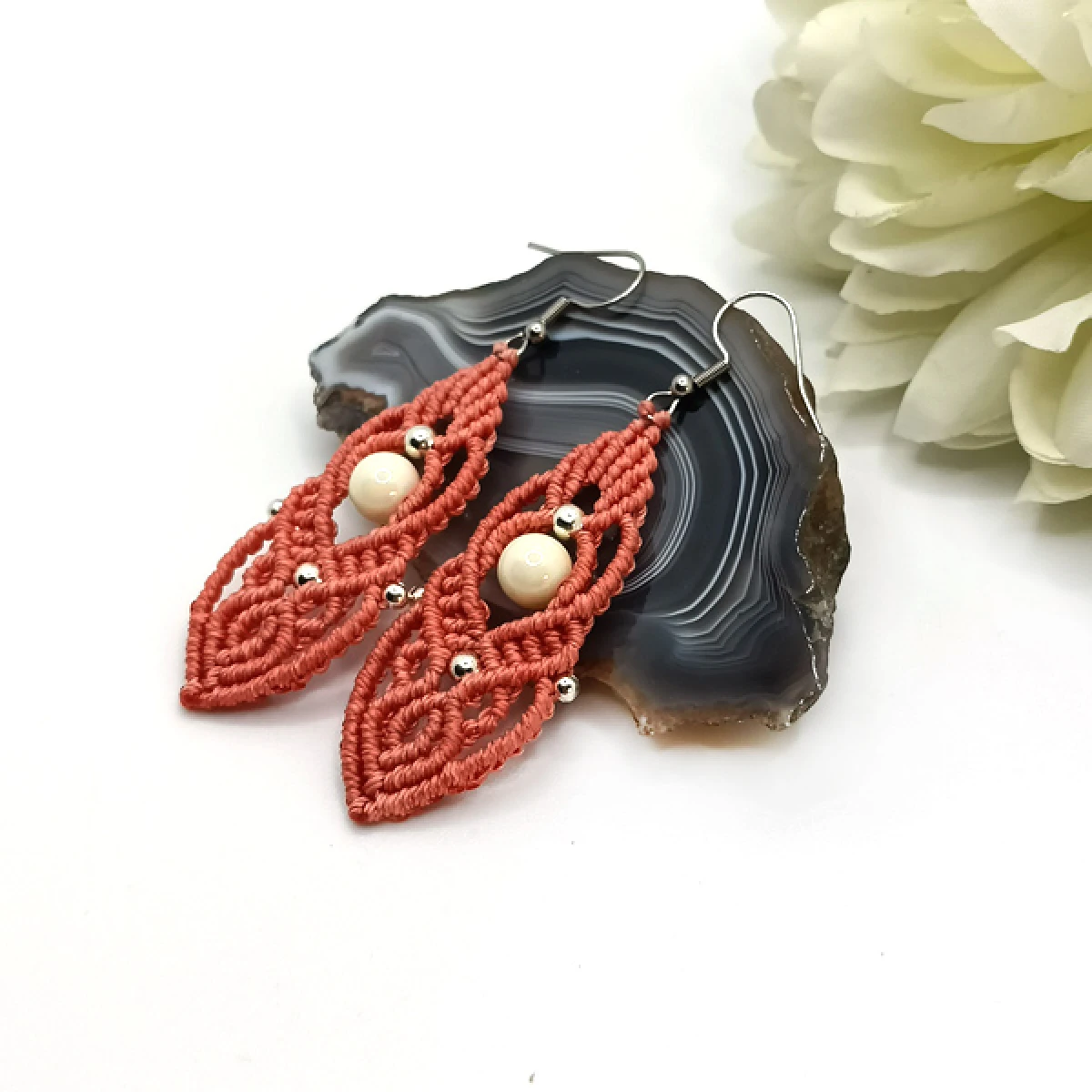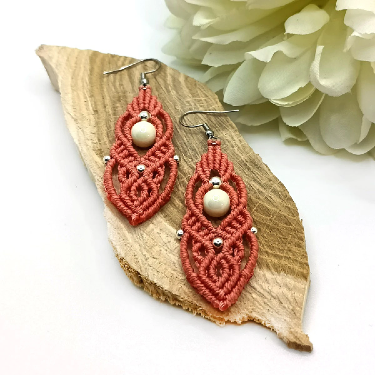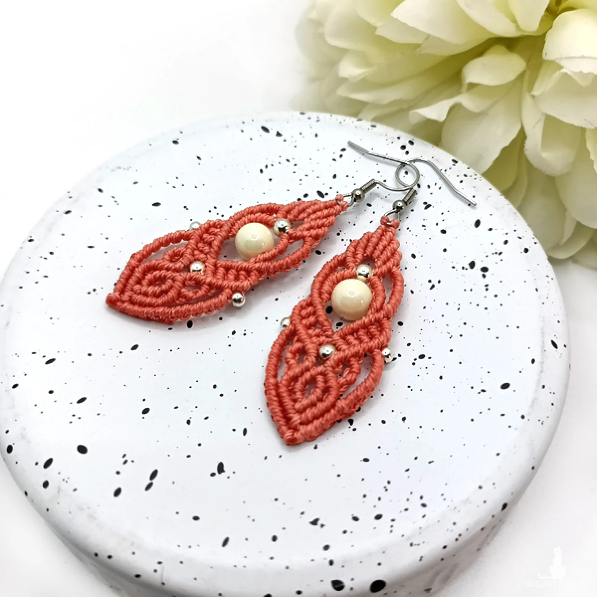 Eleganckie kolczyki wykonane zostały metodą makramową ze sznurka wysokiej jakości, który jest przystosowany do wyrobu tego rodzaju biżuterii. Jest mocny i trwały a wyroby z niego nie zmieniają ani swojej pierwotnej formy ani koloru. Kolczyki są w kolorze łososiowym z akrylowym koralikiem w środku w kolorze ecru. Bigle i ozdobne kulki w kolorze srebrnym ze stali chirurgicznej. Długość kolczyka z biglem 7 cm (bez bigla ok. 5 cm), szerokość 2,5 cm. Są uniwersalne i pasują do każdej stylizacji na każdą porę dnia. Biżuteria pakowana jest w ozdobne pudełko.