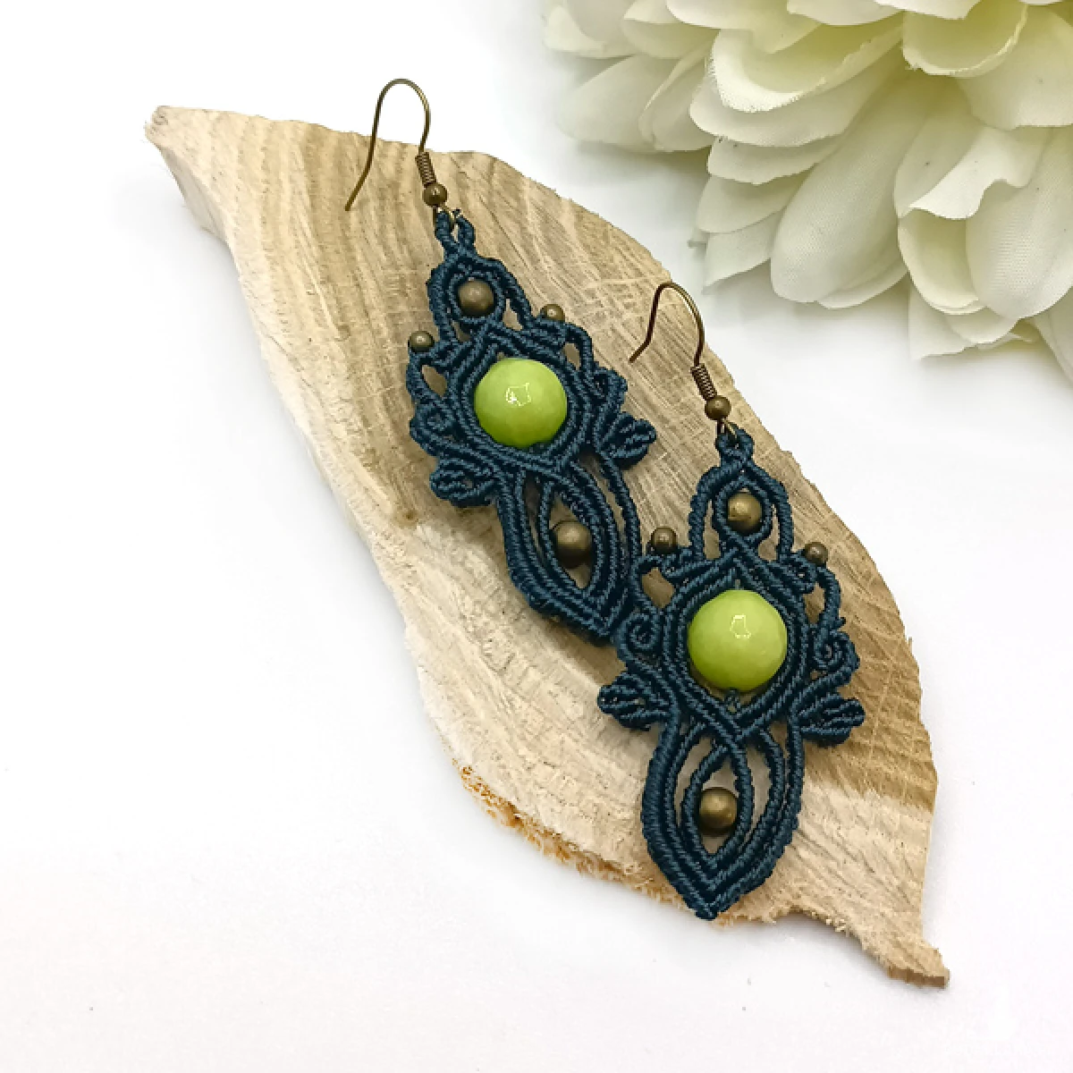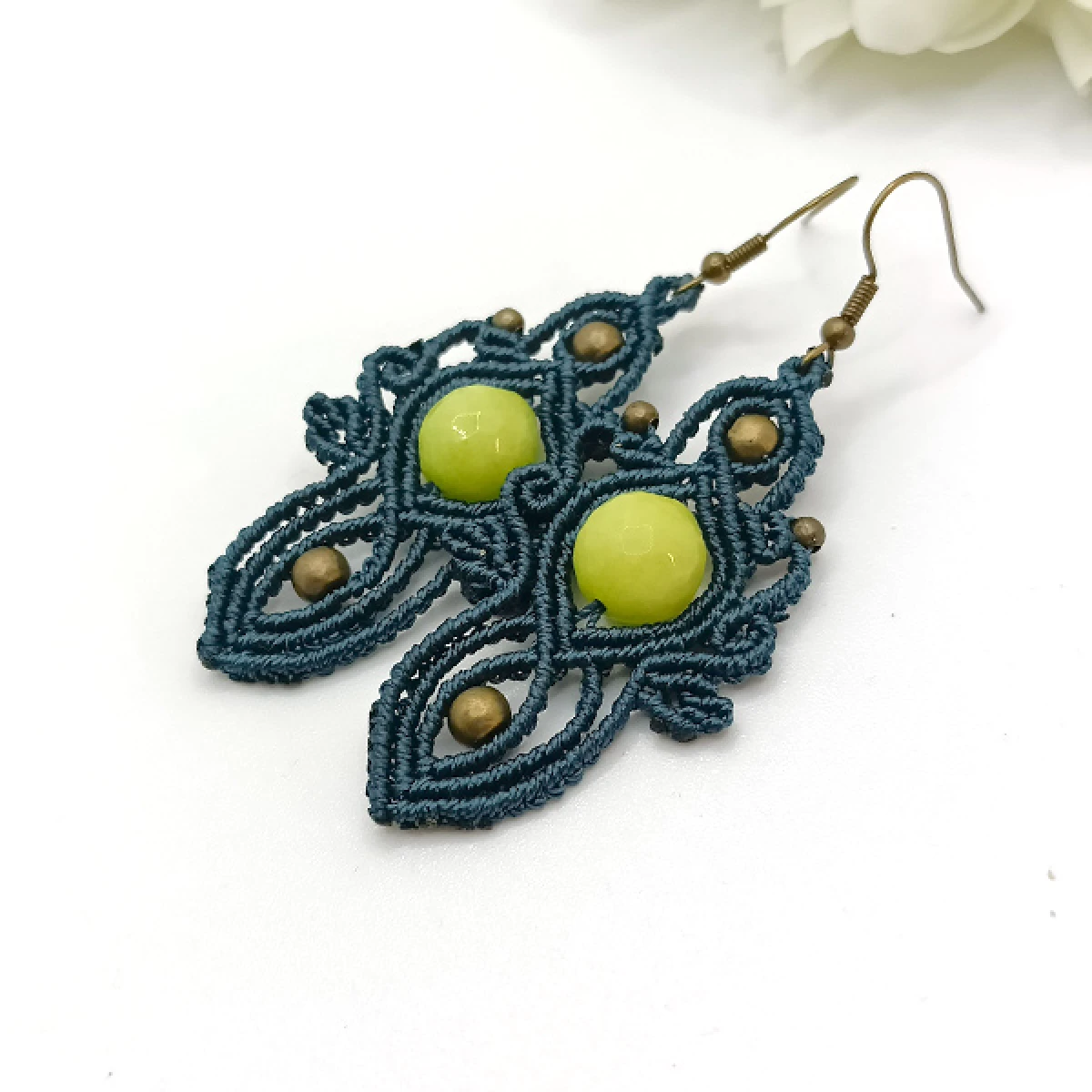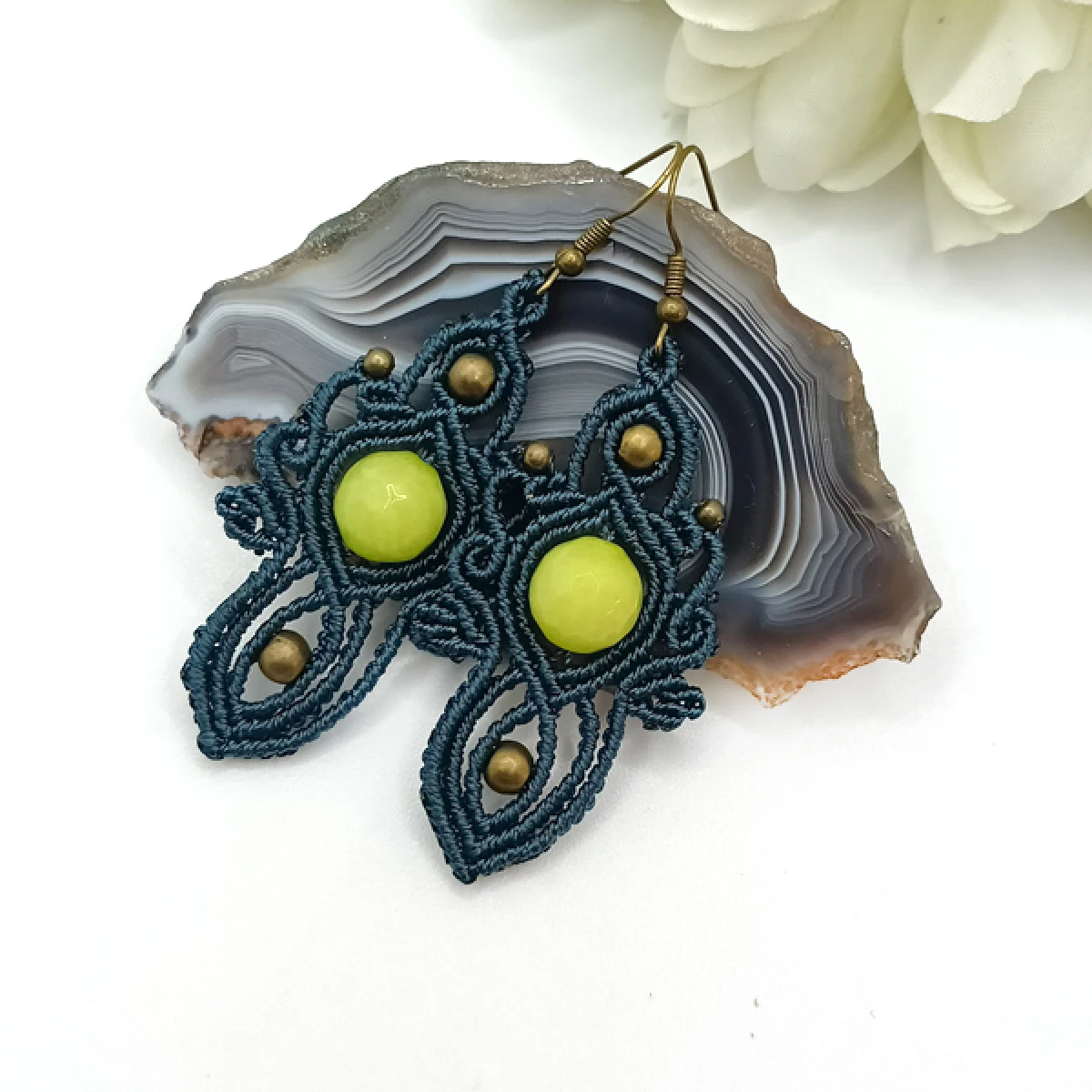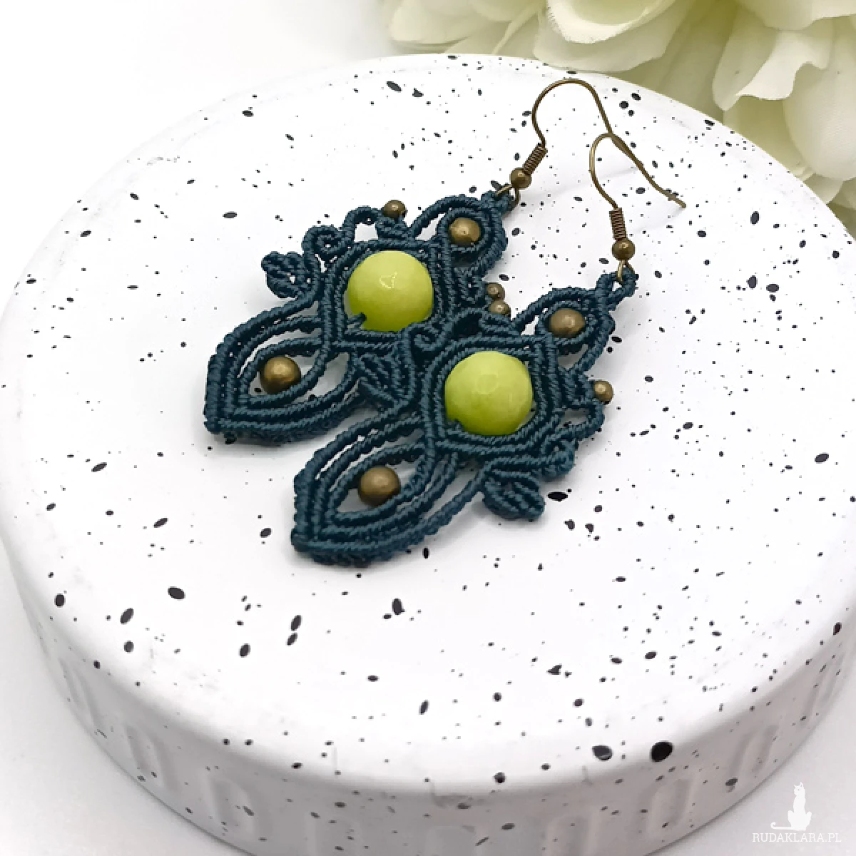 Eleganckie kolczyki wykonane zostały metodą makramową ze sznurka wysokiej jakości, który jest przystosowany do wyrobu tego rodzaju biżuterii. Jest mocny i trwały a wyroby z niego nie zmieniają ani swojej pierwotnej formy ani koloru. Kolczyki są w kolorze ciemnozielonym z fasetowanym cytrynem w środku. Bigle i ozdobne kulki w oliwkowym kolorze ze stali chirurgicznej. Długość kolczyka z biglem ok. 7,5 cm (bez bigla ok. 5,5 cm), szerokość 2,5 cm. Są uniwersalne i pasują do każdej stylizacji na każdą porę dnia. Biżuteria pakowana jest w ozdobne pudełko.