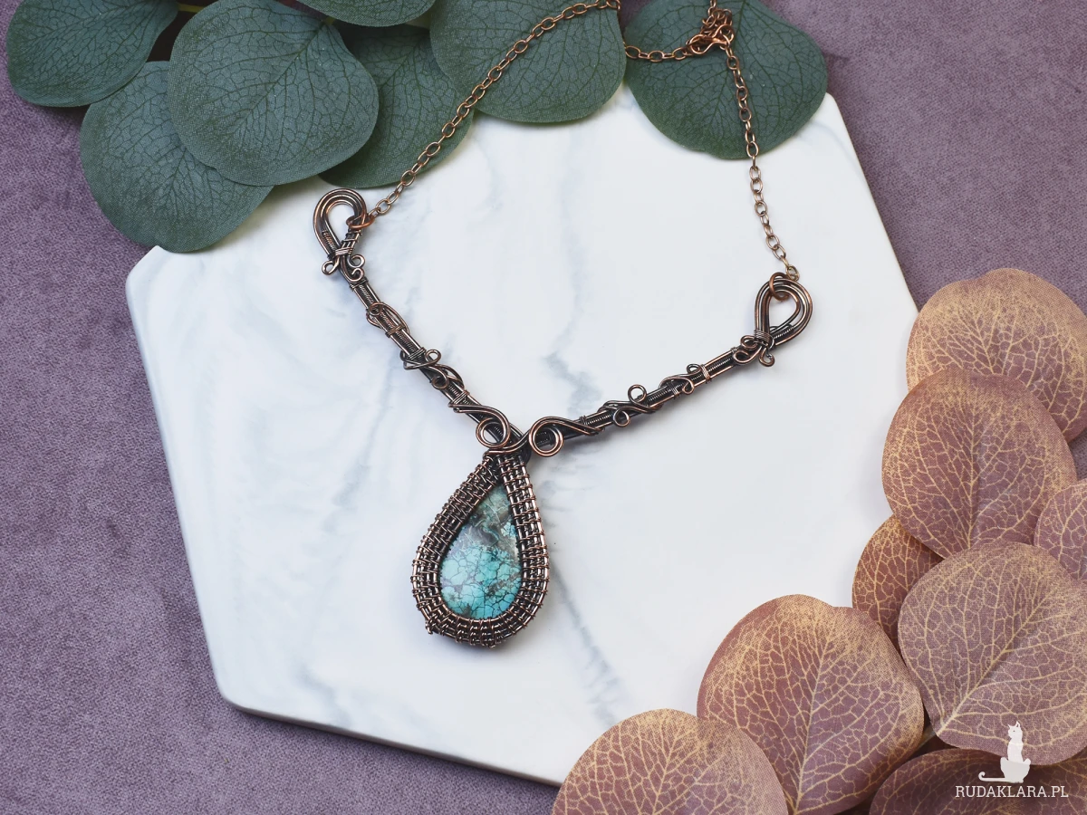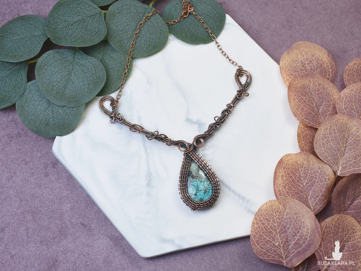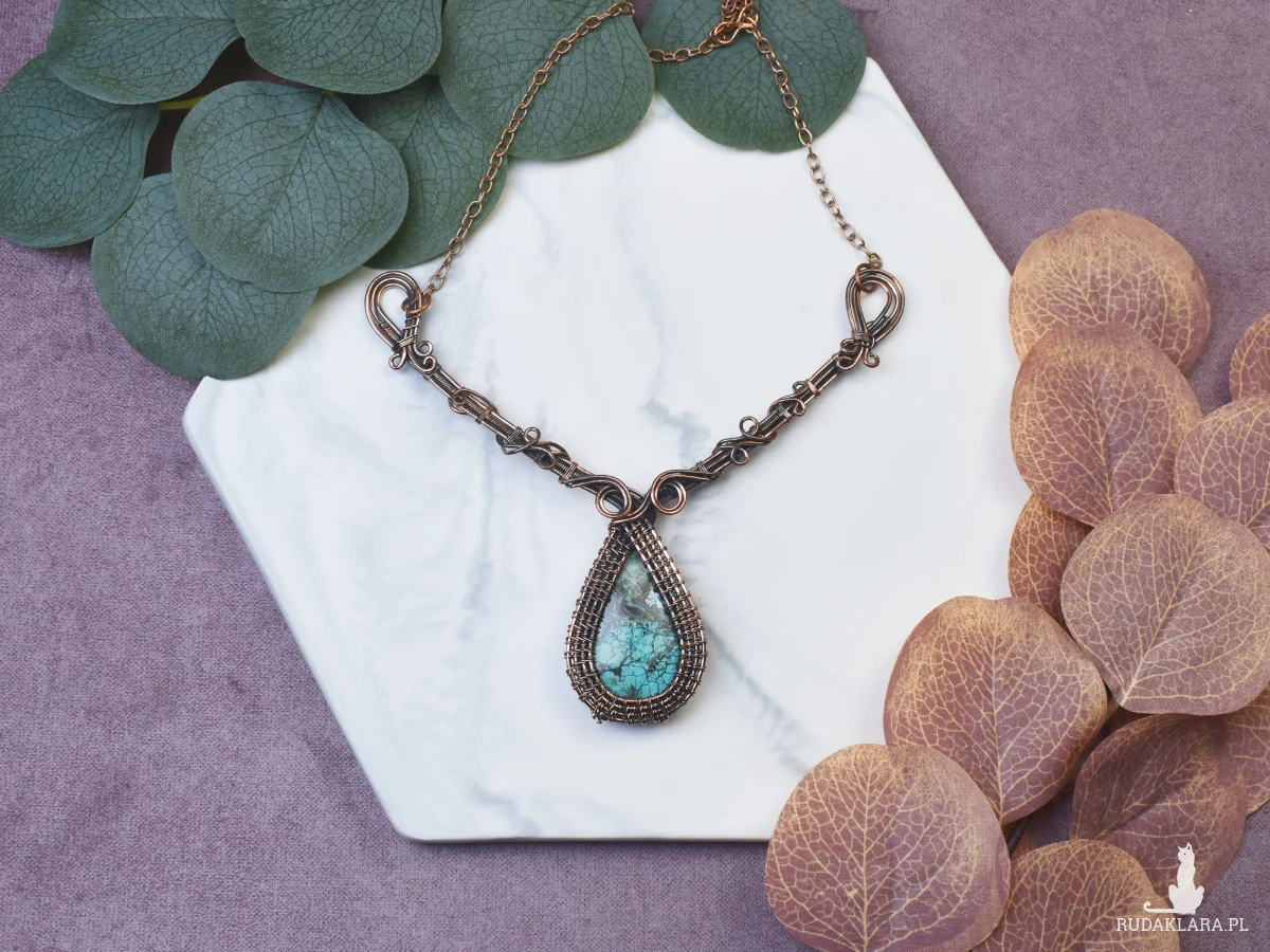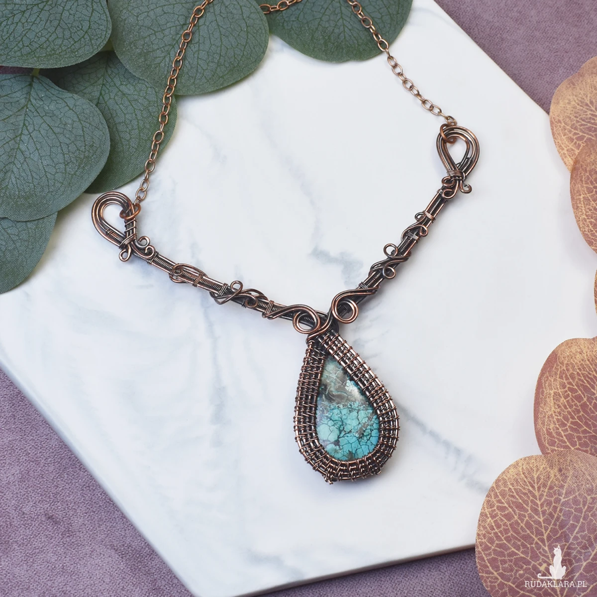 Miedziany naszyjnik wire wrapping z turkusem #493