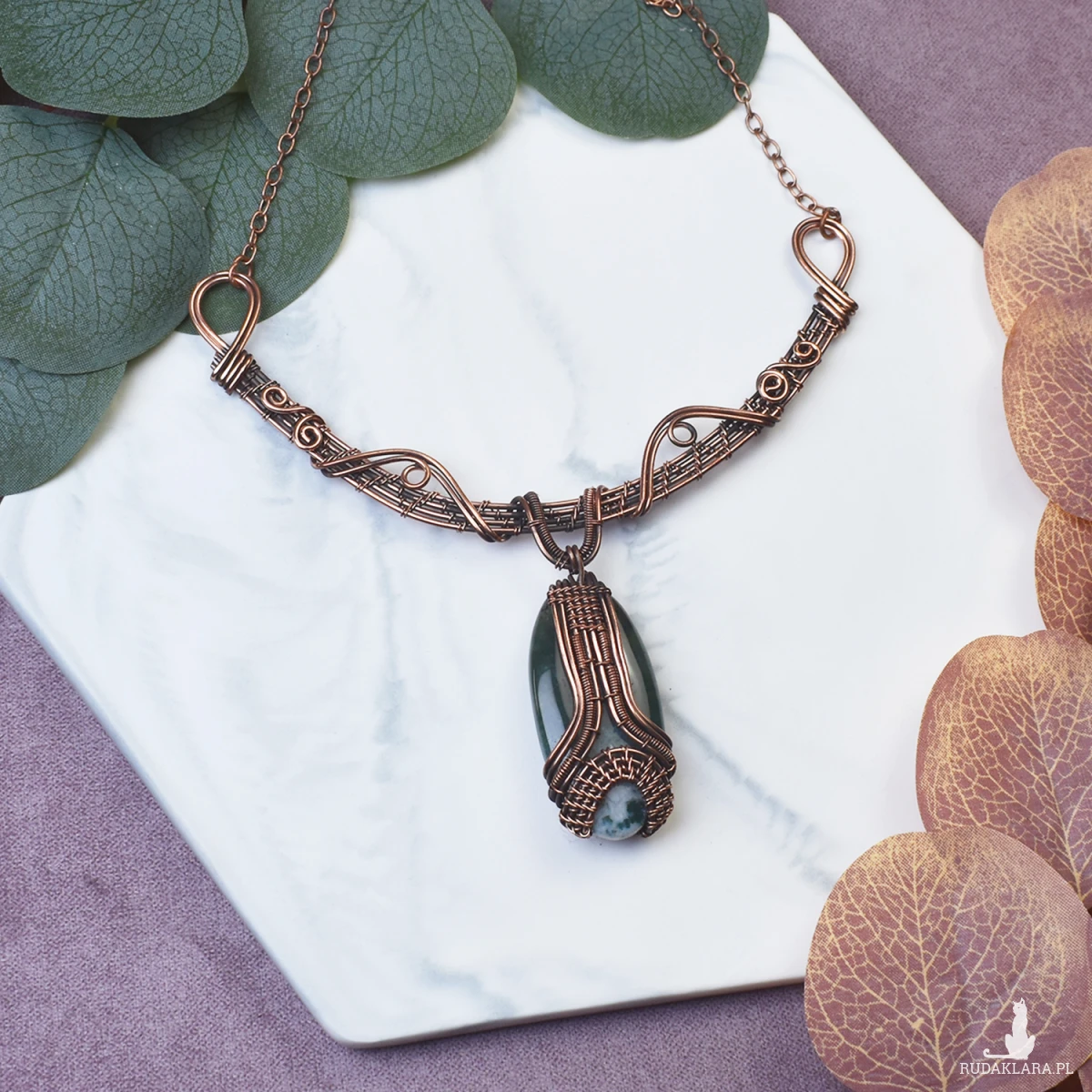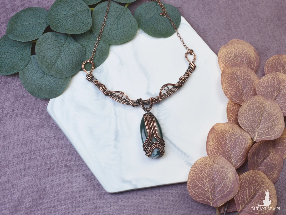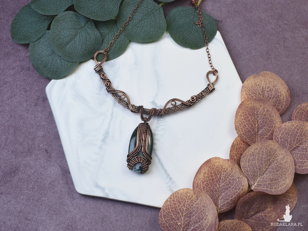 Miedziany naszyjnik wire wrapping z agatem mszystym #494