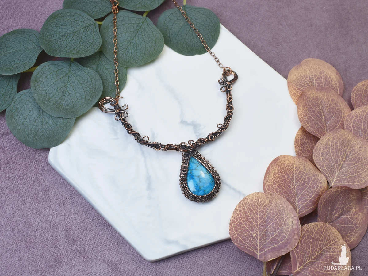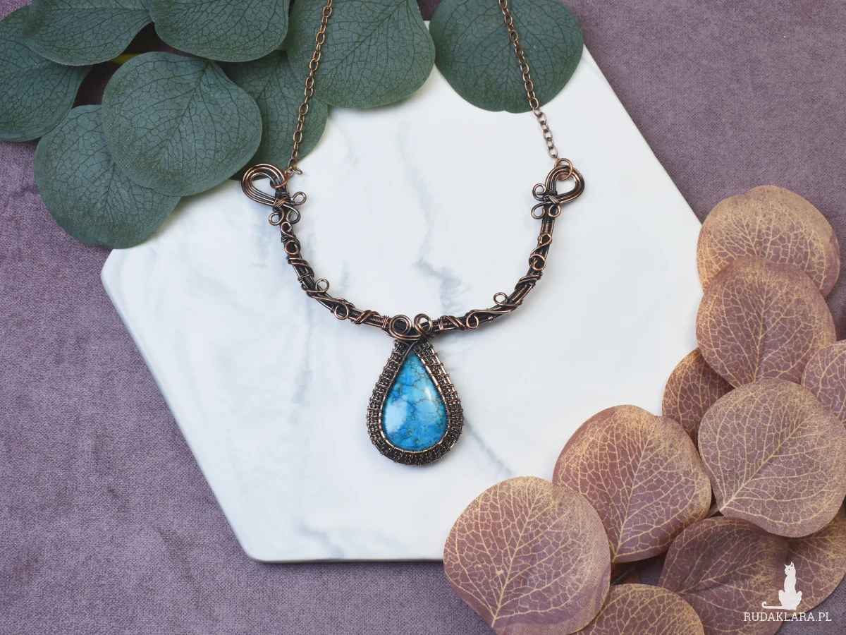 Ten miedziany naszyjnik z turkusem wyróżnia się unikalną techniką wire wrapping. Mistrzowsko owinięte druty podkreślają piękno surowego turkusu, nadając całości industrialno-etnicznego charakteru. Naszyjnik emanuje prostotą i elegancją, a turkus, uważany za kamień ochronny, dodaje mu subtelnej mocy. To wyjątkowe połączenie ręcznej pracy i naturalnych elementów sprawia, że naszyjnik jest nie tylko pięknym dodatkiem do stylizacji, ale także nosicielem pozytywnej energii.