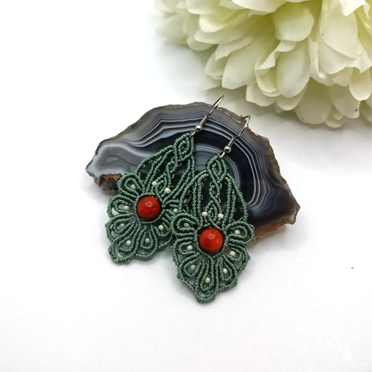 Eleganckie kolczyki wykonane zostały metodą makramową ze sznurka wysokiej jakości, który jest przystosowany do wyrobu tego rodzaju biżuterii. Jest mocny i trwały a wyroby z niego nie zmieniają ani swojej pierwotnej formy ani koloru. Kolczyki są w kolorze khaki z czerwonym koralem i małymi koralikami Toho. Bigle ze stali chirurgicznej. Długość kolczyka z biglem 7 cm (bez bigla ok. 5,5 cm), szerokość 3 cm. Są uniwersalne i pasują do każdej stylizacji na każdą porę dnia. Biżuteria pakowana jest w ozdobne pudełko.