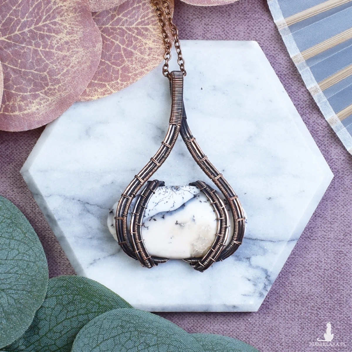 Miedziany wisiorek wire wrapping z opalem dendrytowym #523