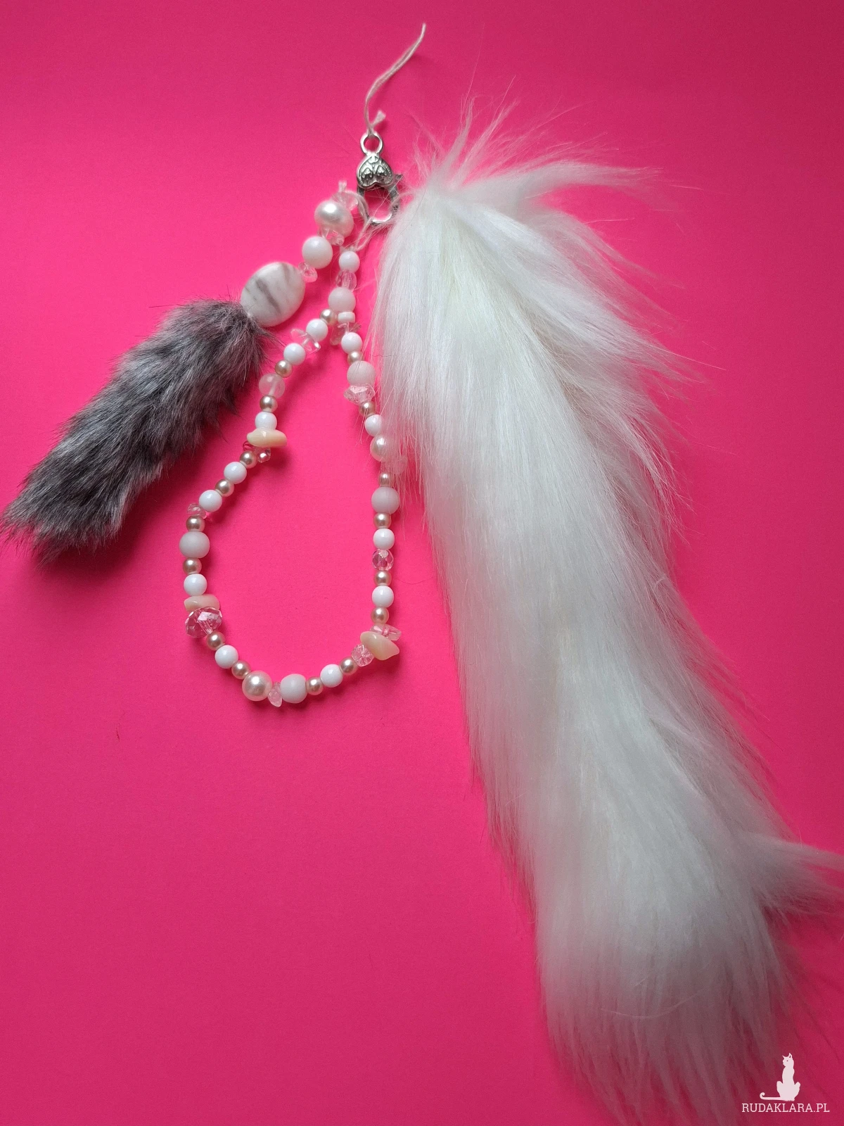 Puchaty brelok do telefonu składający się z trzech części: dużego futrzanego pompona, smyczki z białych szklanych koralików, howlitów i kryształków górskich, oraz mniejszego pomponika z koralikami. Elementy można nosić razem, lub każdy z osobna. Całość zamontowana jest na karabińczyku ze sznureczkem, który podpinamy do telefonu.