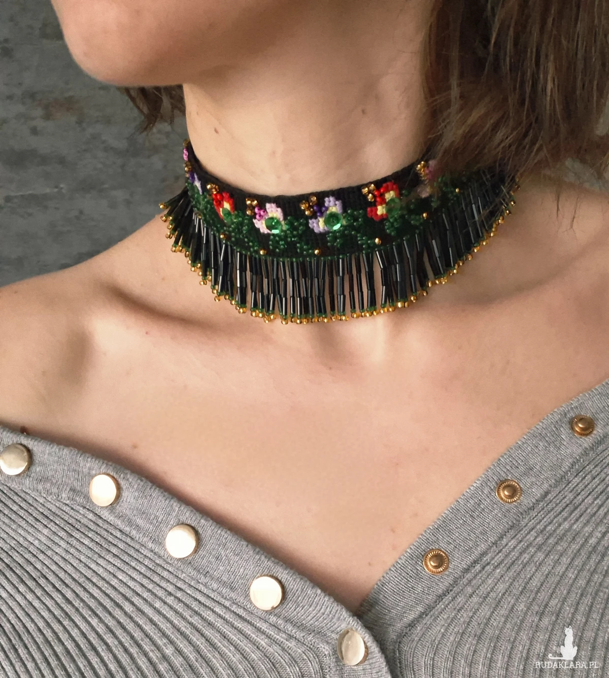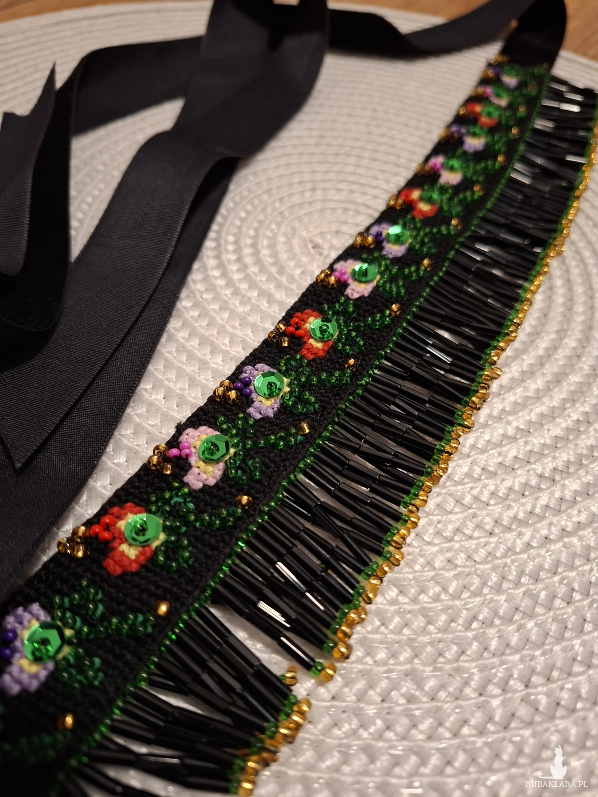 Śliczny naszyjnik haftowany. Ozdobiony koralikami. Wszystko przyszyte do taśmy aksamitnej. Oryginalny prezent dla bliskiej osoby.