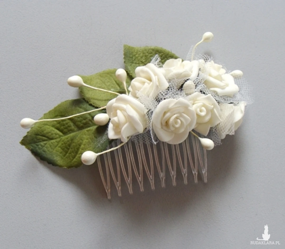 Delikatny grzebyk do włosów w stonowanej kolorystyce, ozdobiony lekkimi, subtelnymi kwiatuszkami w naturalnych odcieniach. Pięknie uzupełnia fryzury zarówno rozpuszczone, jak i upięte, dodając uroku stylizacji na uroczystości ślubne, komunijne czy inne wyjątkowe okazje. Ręcznie wykonany, wyjątkowy detal z nutką romantyzmu.