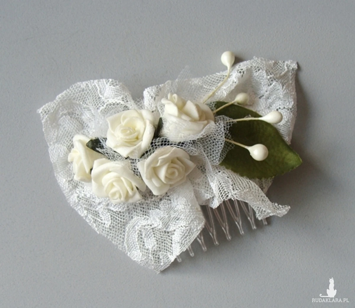 Delikatny grzebyk do włosów w stonowanej kolorystyce, ozdobiony lekkimi, subtelnymi kwiatuszkami w naturalnych odcieniach. Pięknie uzupełnia fryzury zarówno rozpuszczone, jak i upięte, dodając uroku stylizacji na uroczystości ślubne, komunijne czy inne wyjątkowe okazje. Ręcznie wykonany, wyjątkowy detal z nutką romantyzmu.Materiały: tkanina, plastik, inne