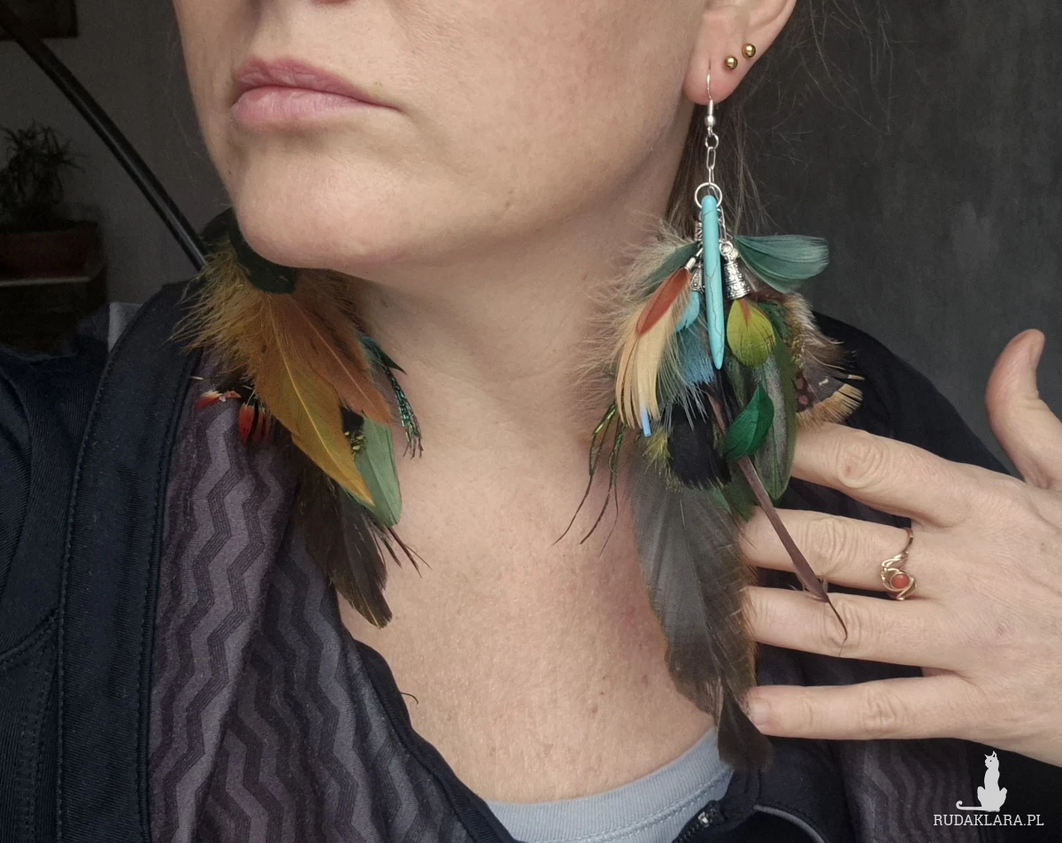 Kolczyki kolorowe energetyczne  pióra duże lekkie wykonane w pojedynczym egzemplarzu rękodzieło