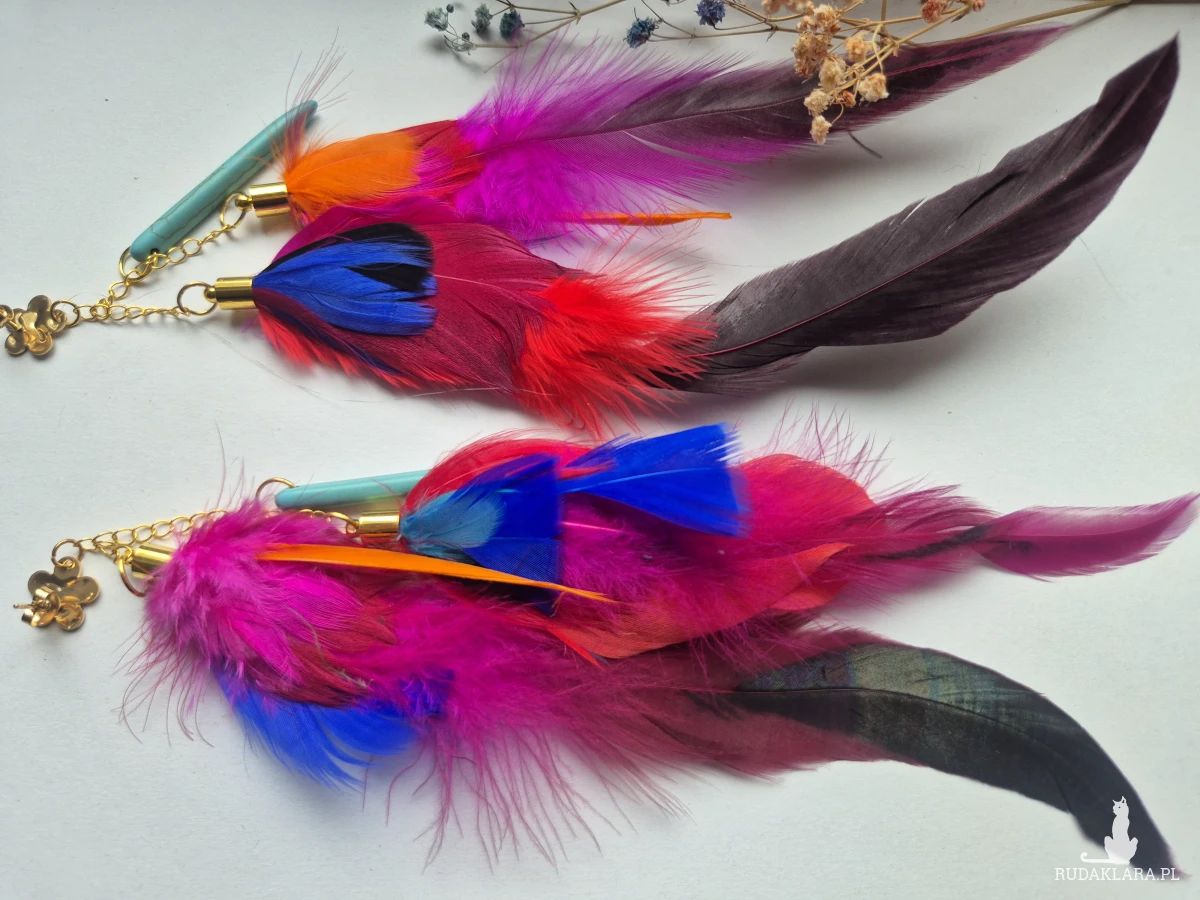 Kolczyki kolorowe energetyczne  pióra duże lekkie wykonane w pojedynczym egzemplarzu rękodzieło