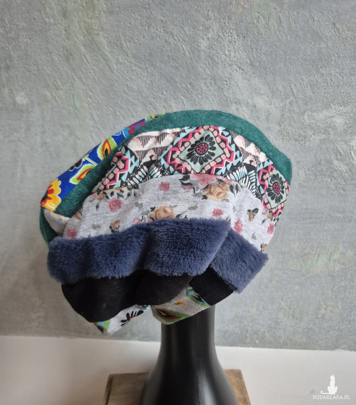 Czapka damska Smerfetka patchworkowa, na podszewce dobra na codzienne noszenie, wykonana w pojedynczym egzemplarzu rękodzieło polecam boks a1