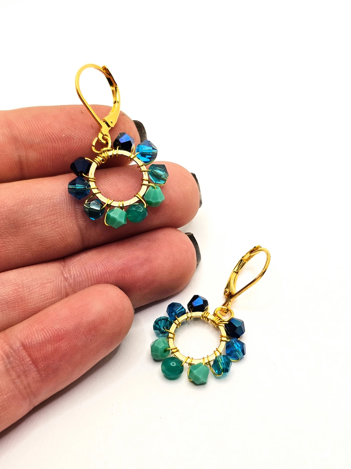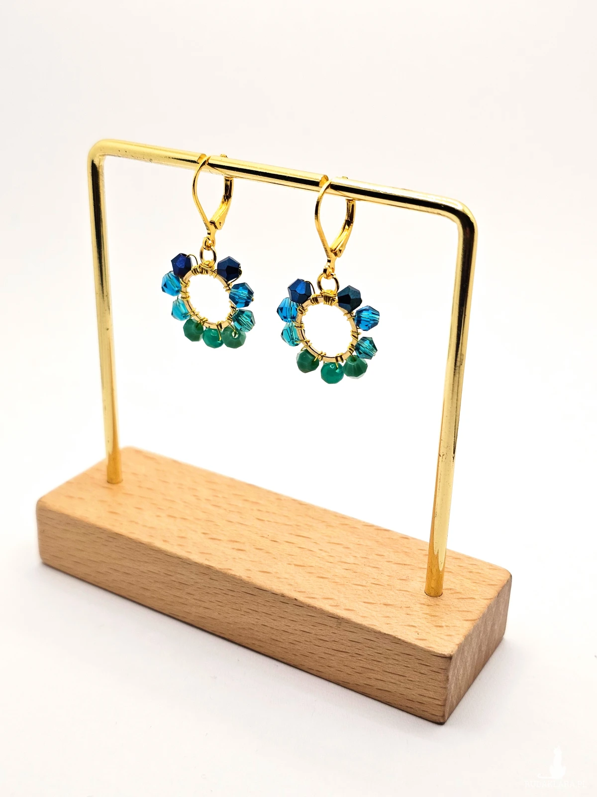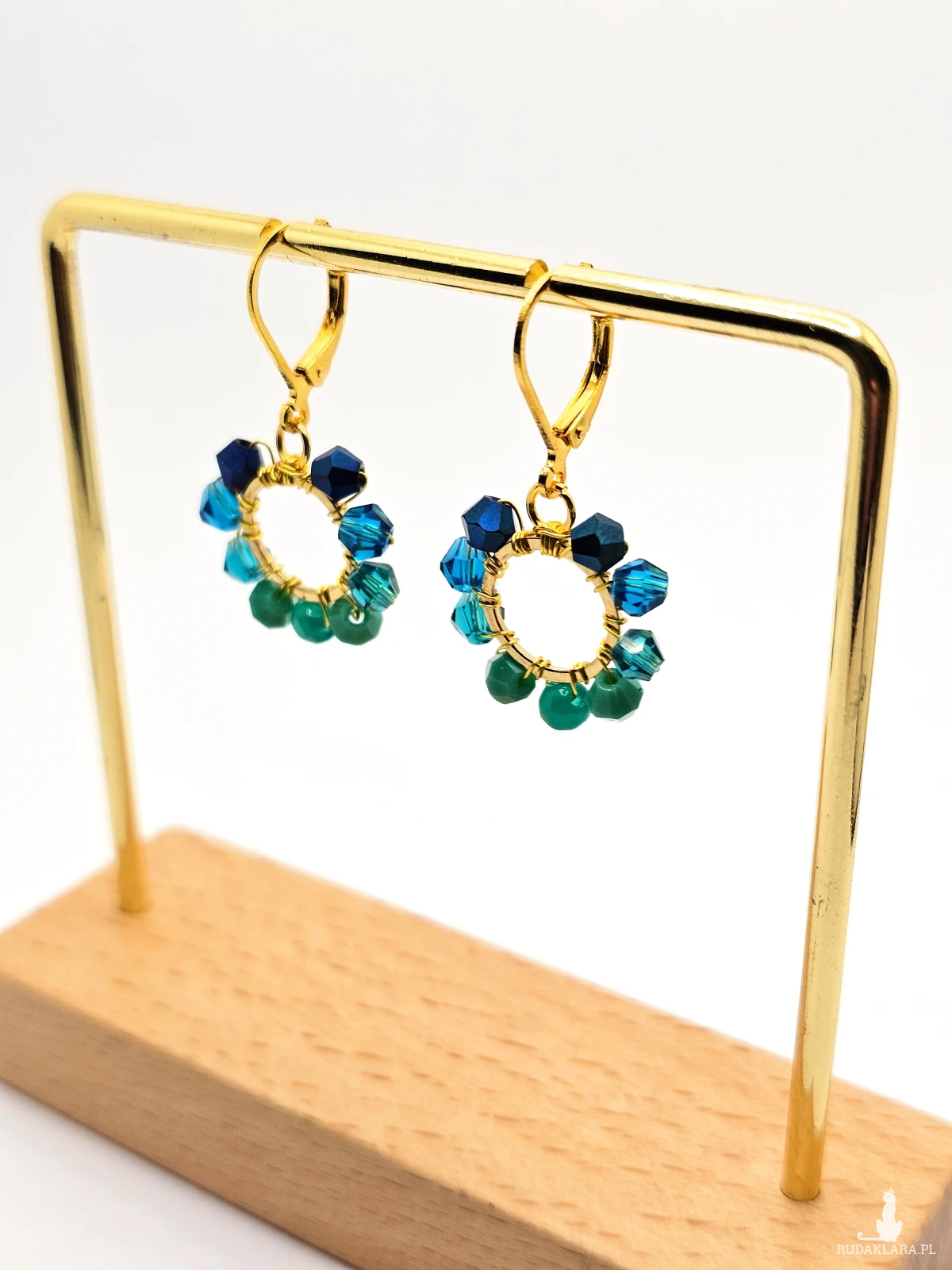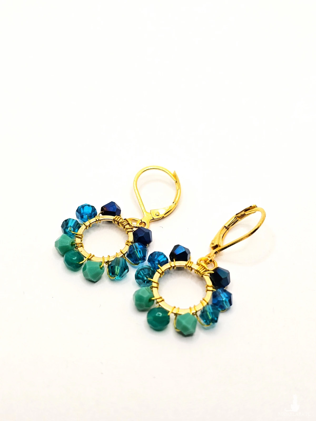 Wiszące kolczyki z szklanymi koralikami i kryształkami. Metalowa baza opleciona kolorowymi koralikami. Kolory w kolczykach: złoty, granatowy, niebieski, turkusowy. Kolczyki zawieszone na biglach angielskich w kolorze złotym.