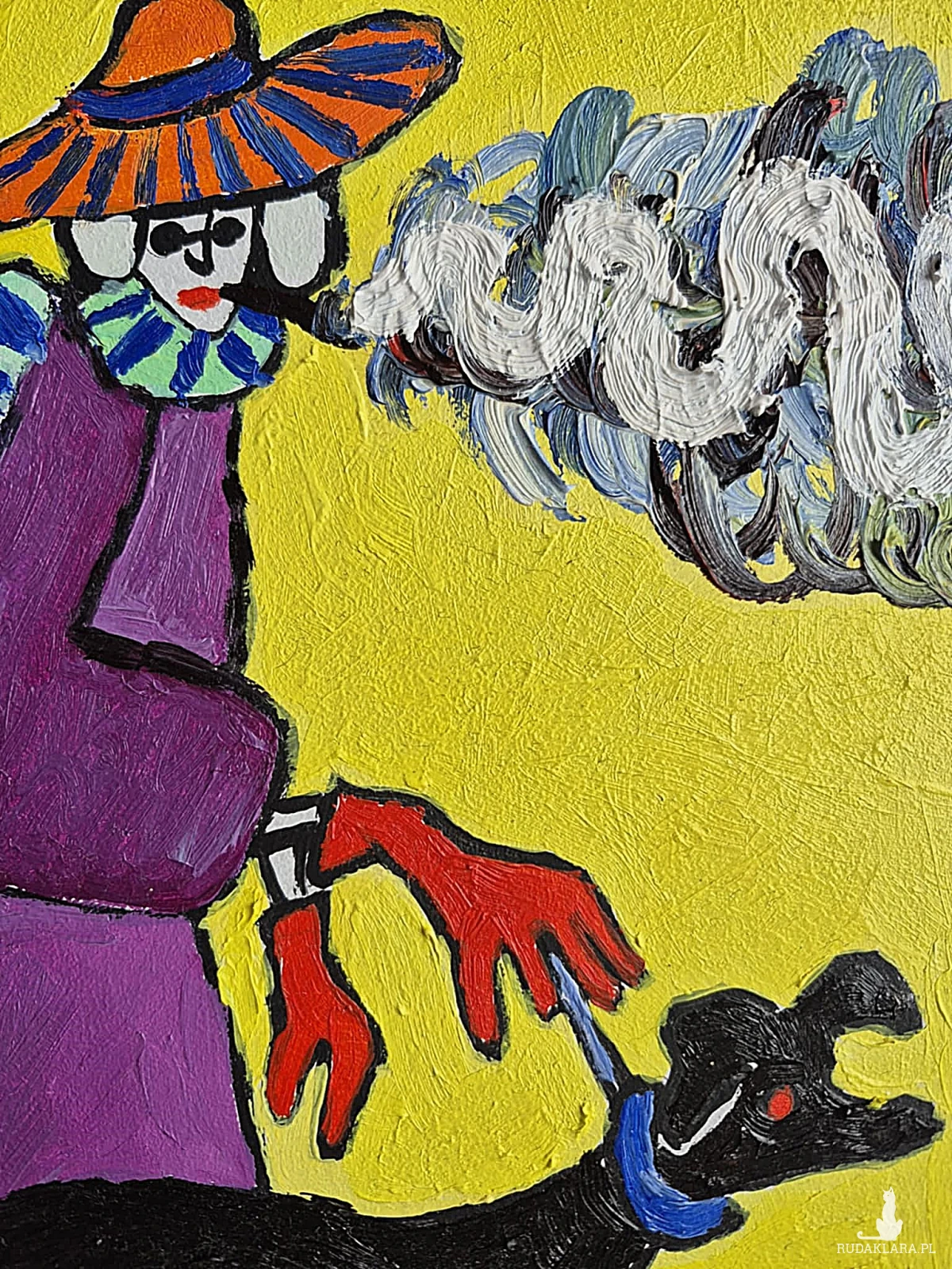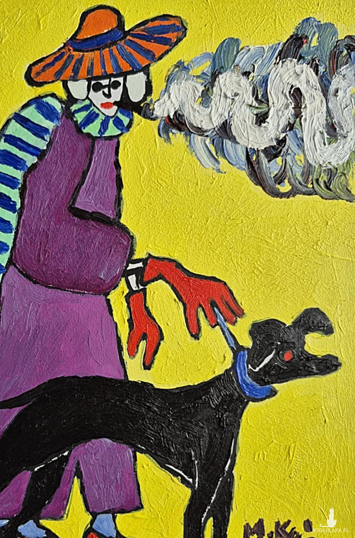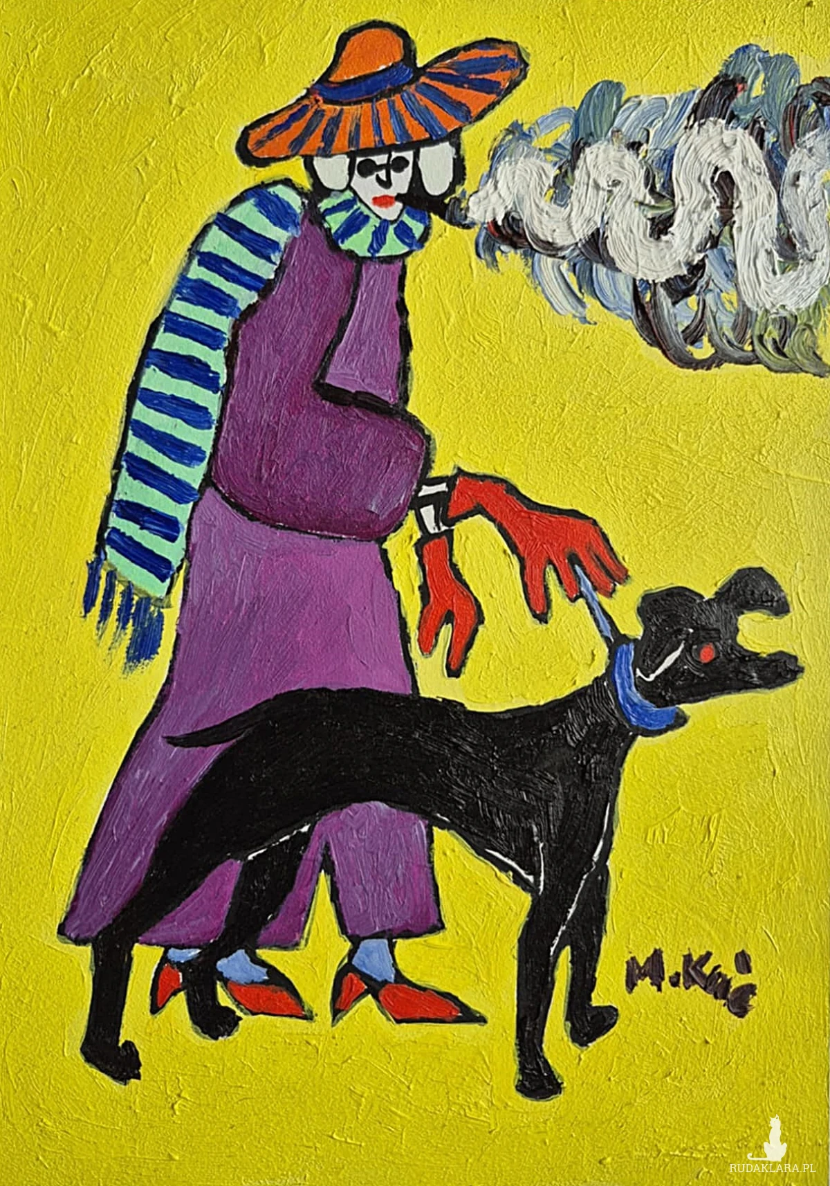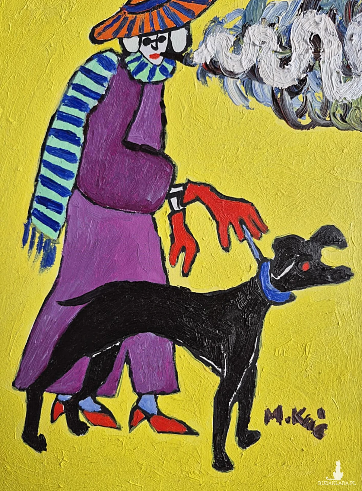 Obok niej znajduje się czarny pies o wydłużonej sylwetce, prowadzony na smyczy. Jego ciało jest niemal graficzne – płaskie, mocno obrysowane konturem. Czerwone detale (dłonie kobiety, buty, oko psa) wprowadzają rytm i lekki niepokój, jakby obraz balansował między codzienną sceną a czymś surrealnym.