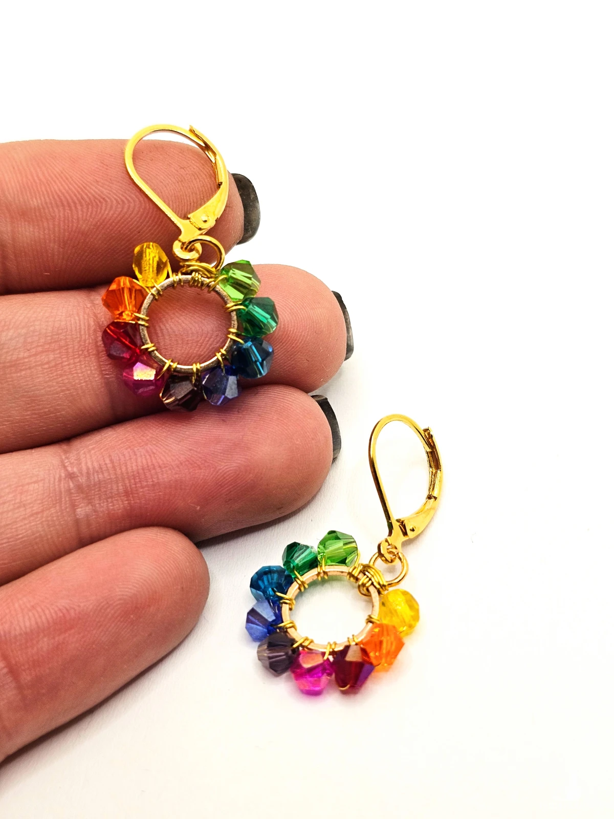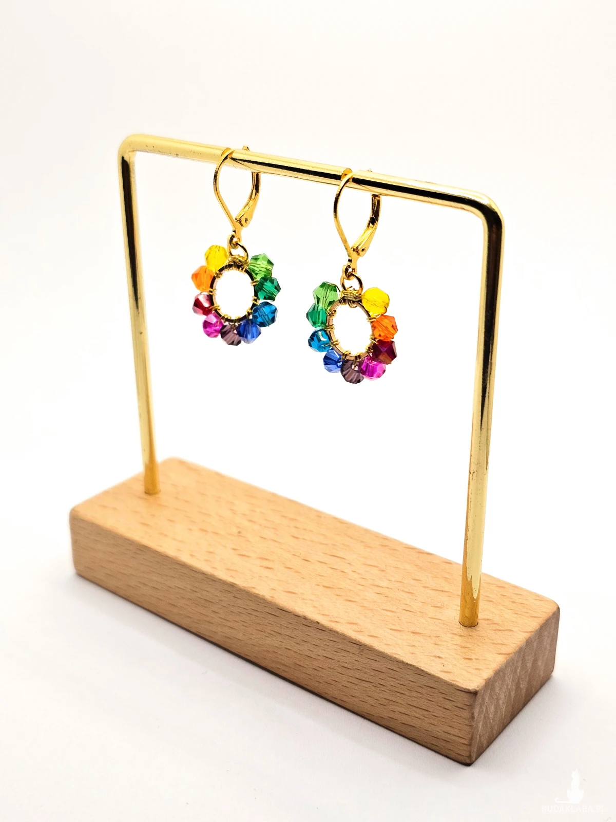 Wiszące kolczyki z szklanymi koralikami i kryształkami. Metalowa baza opleciona kolorowymi koralikami. Kolory w kolczykach: złoty, niebieski, fioletowy, różowy, czerwony, pomarańczowy, żółty, zielony, turkusowy. Kolczyki zawieszone na biglach angielskich w kolorze złotym.