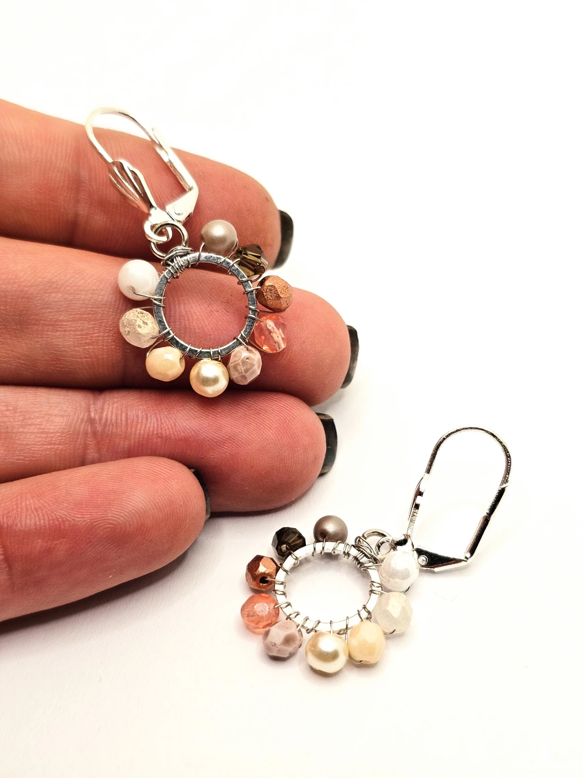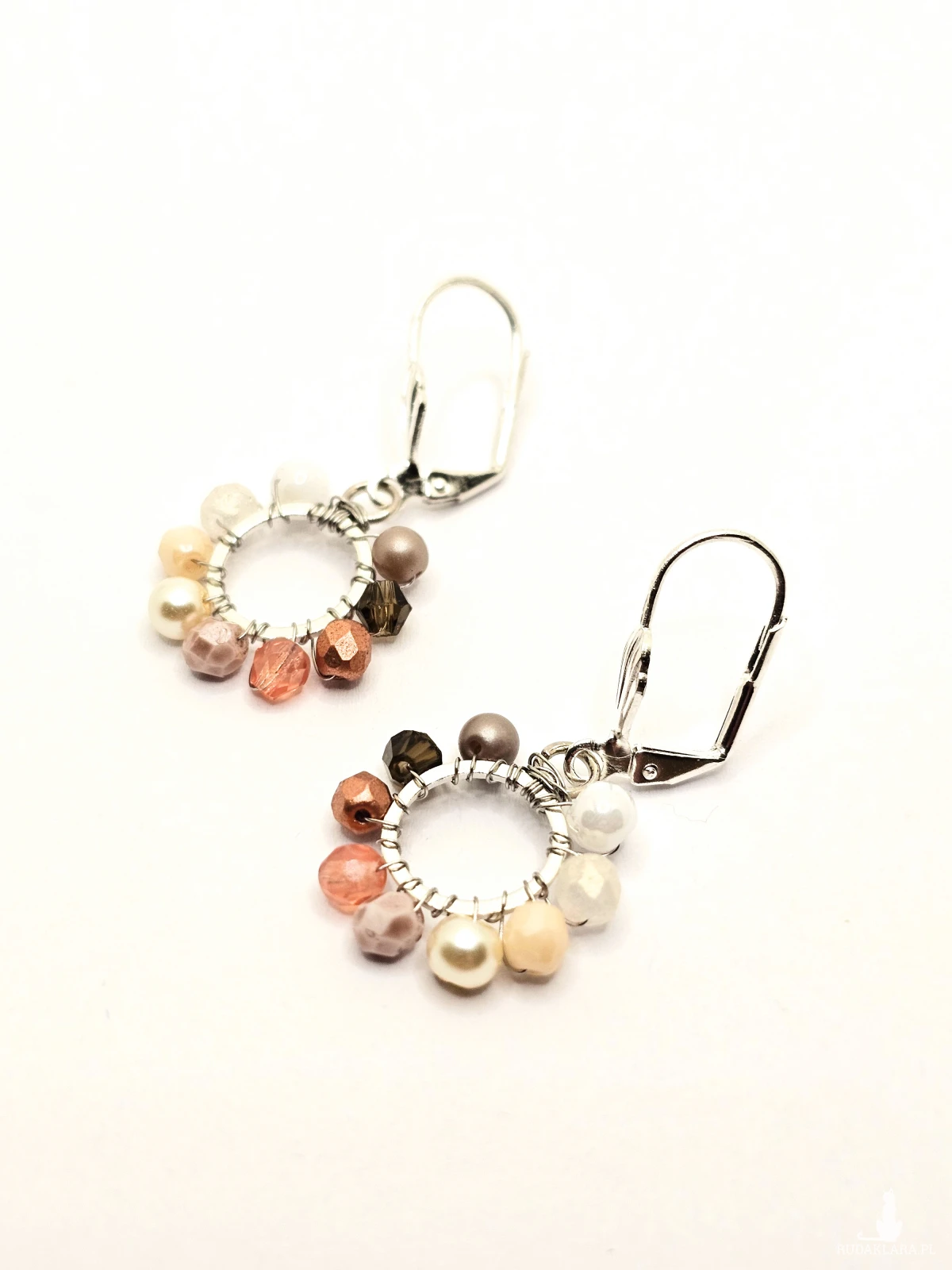Wiszące kolczyki z szklanymi koralikami i kryształkami. Metalowa baza opleciona kolorowymi koralikami. Kolory w kolczykach: srebrny, biały, kremowy, beżowy, perłowy, różowy. Kolczyki zawieszone na biglach angielskich w kolorze srebrnym.