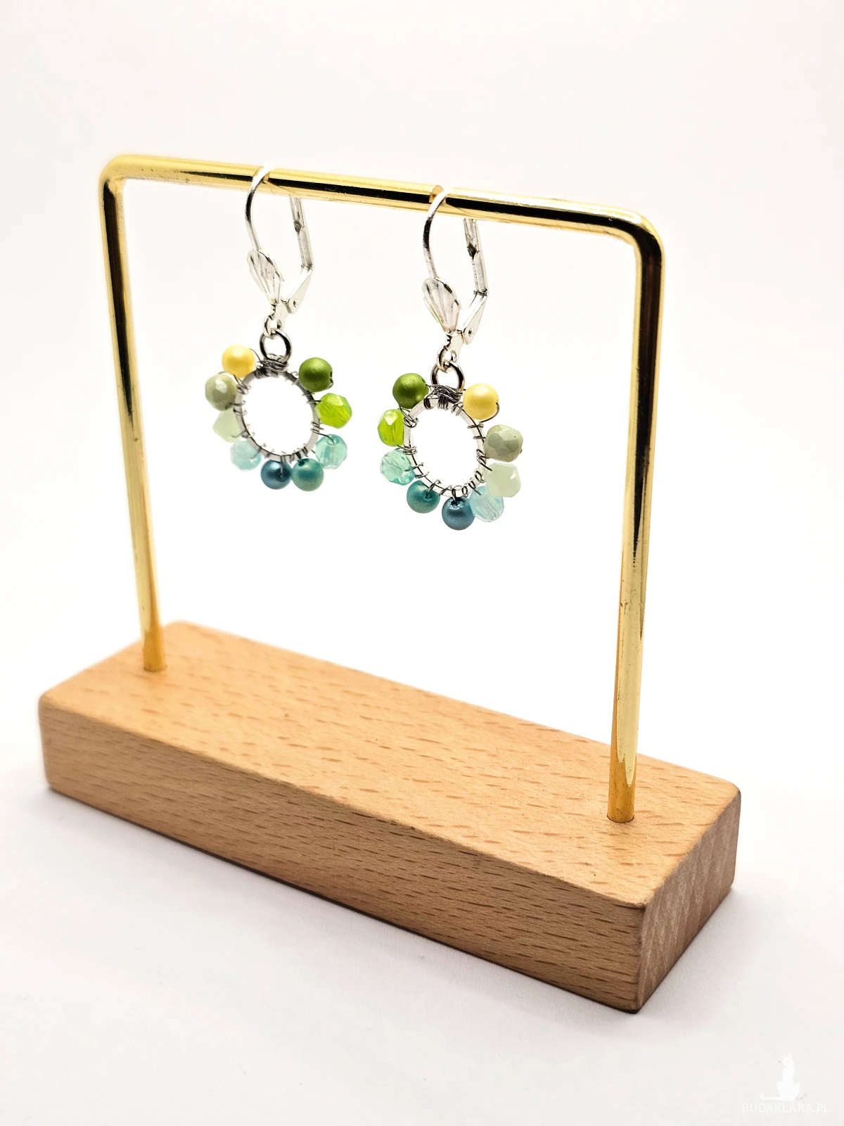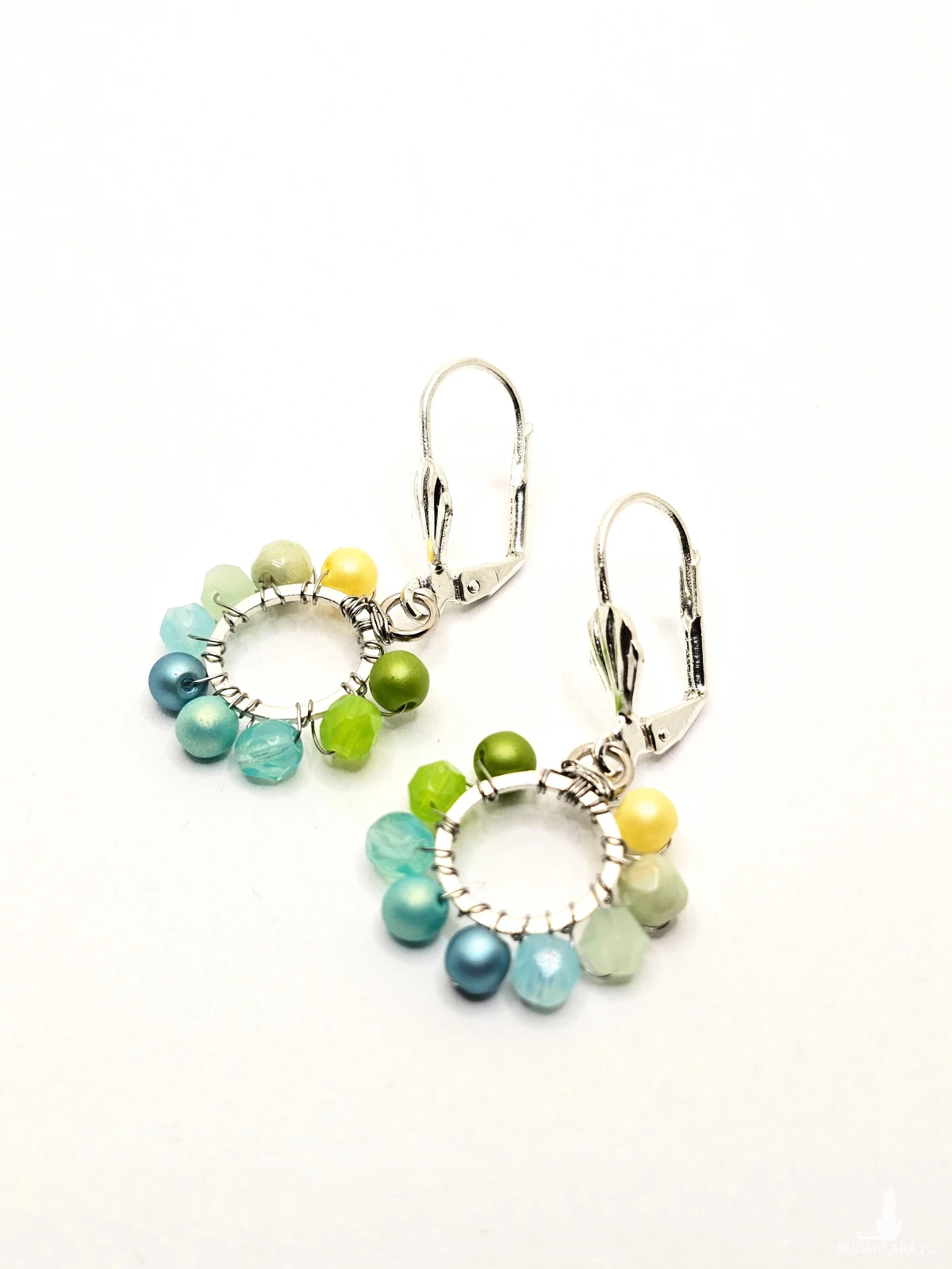 Wiszące kolczyki z szklanymi koralikami i kryształkami. Metalowa baza opleciona kolorowymi koralikami. Kolory w kolczykach: srebrny, żółty, limonkowy, miętowy, turkusowy. Kolczyki zawieszone na biglach angielskich w kolorze srebrnym.