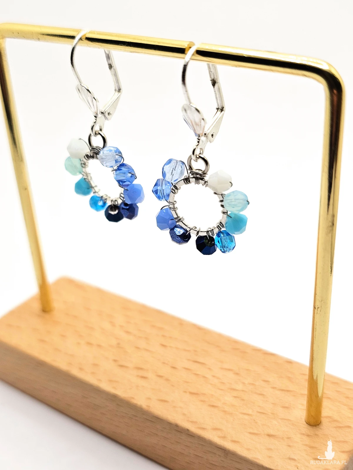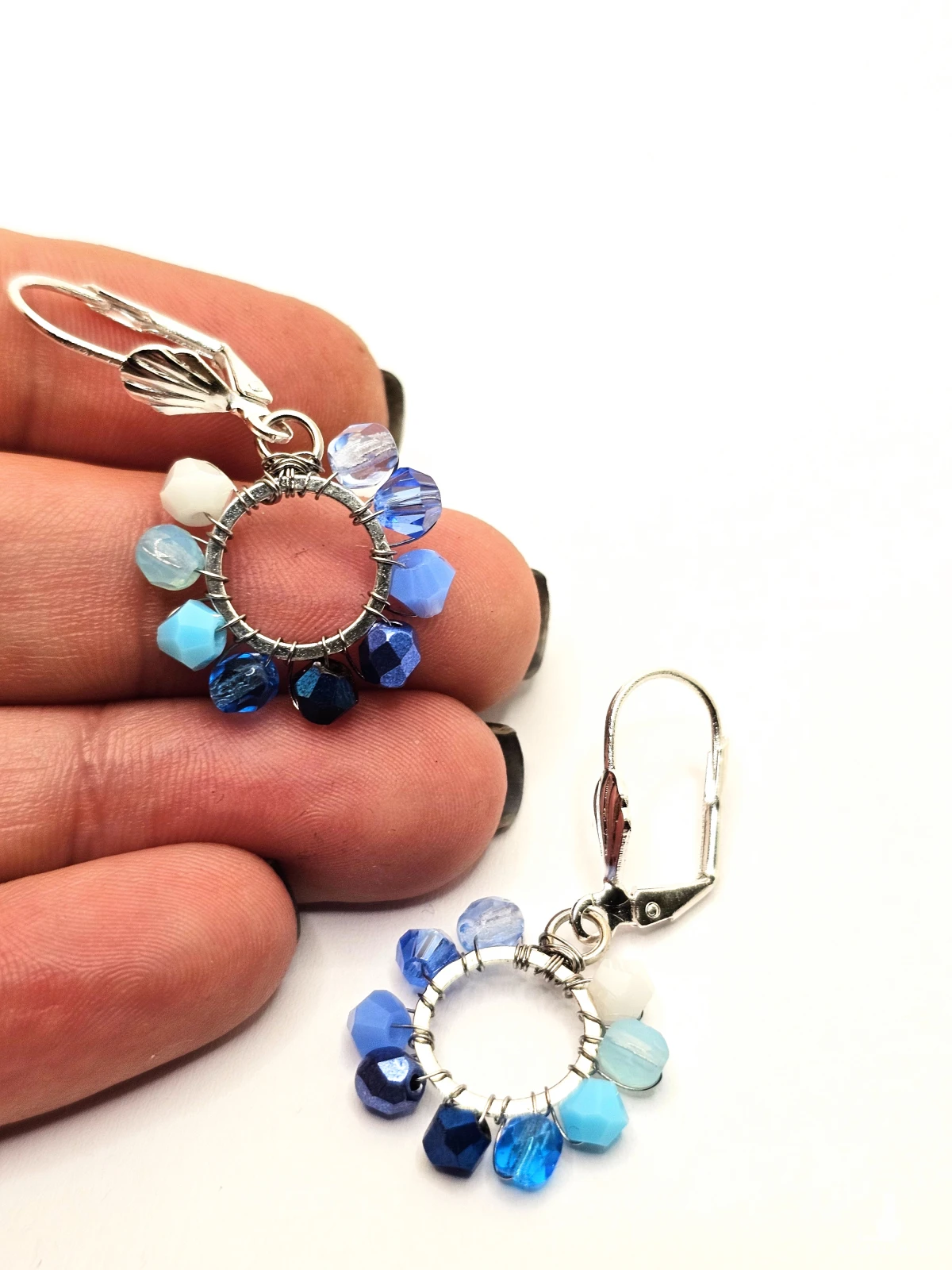 Wiszące kolczyki z szklanymi koralikami i kryształkami. Metalowa baza opleciona kolorowymi koralikami. Kolory w kolczykach: srebrny, biały, błękitny, niebieski. Kolczyki zawieszone na biglach angielskich w kolorze srebrnym.