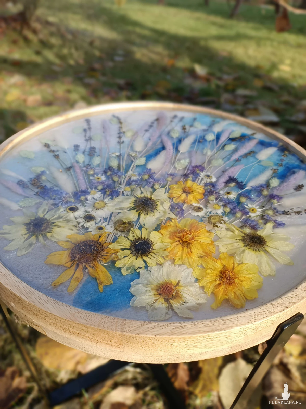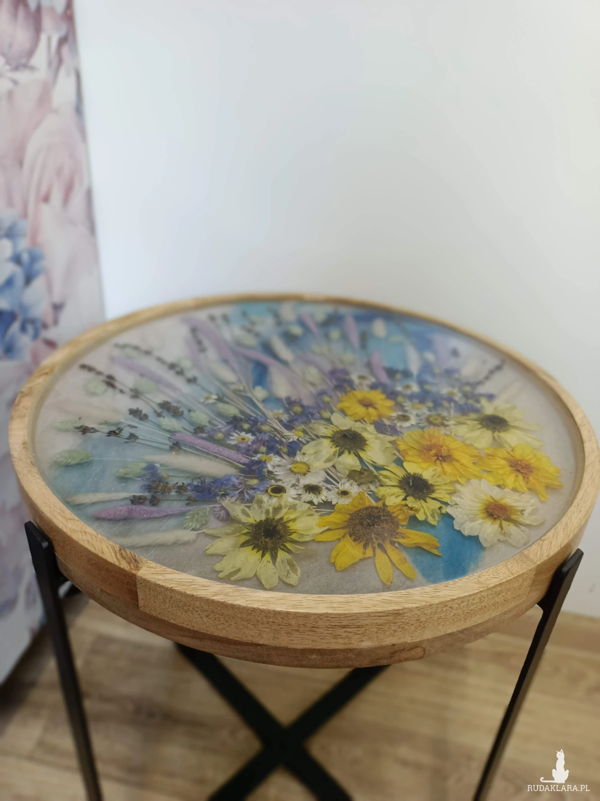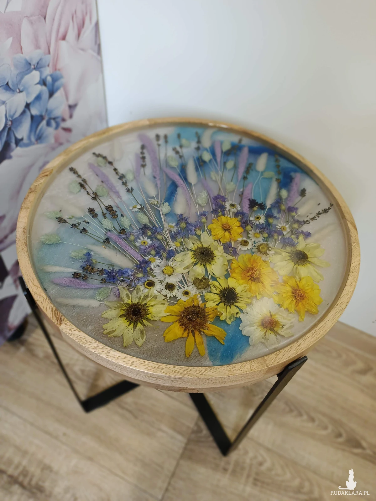 Elegancki stolik kawowy z drewnem i elementami metalowymi z kompozycją kwiatową zamkniętą w żywicy epoksydowej. . Jego klimat przenosi nas do letniego ogrodu. Stolik jest niewielkich rozmiarów, ale swoim wyglądem przyciąga wzrok i może być