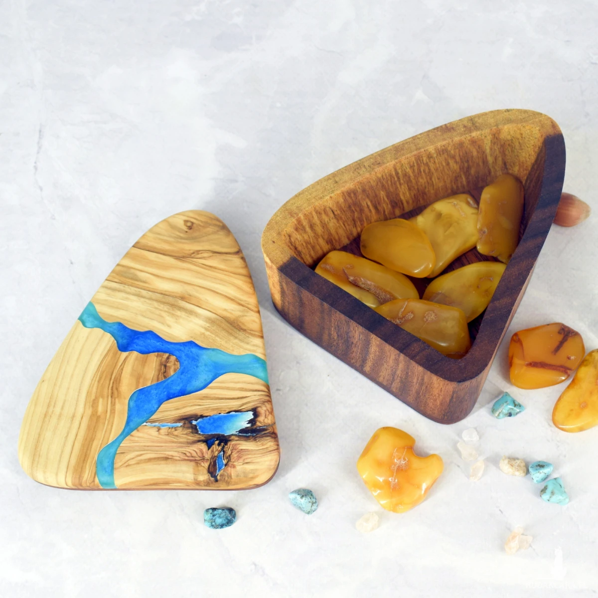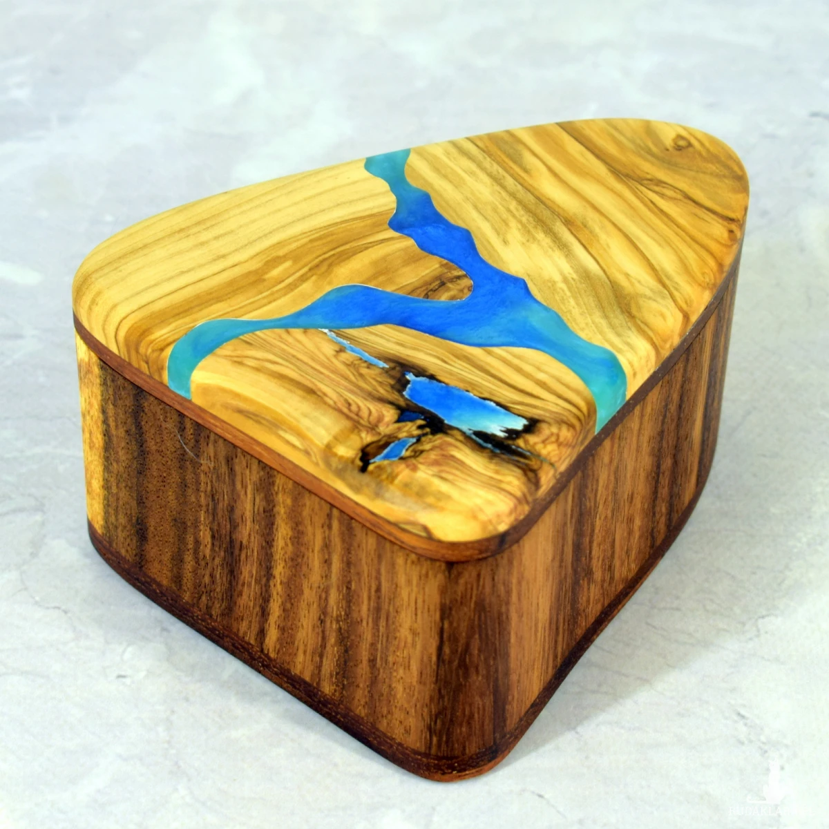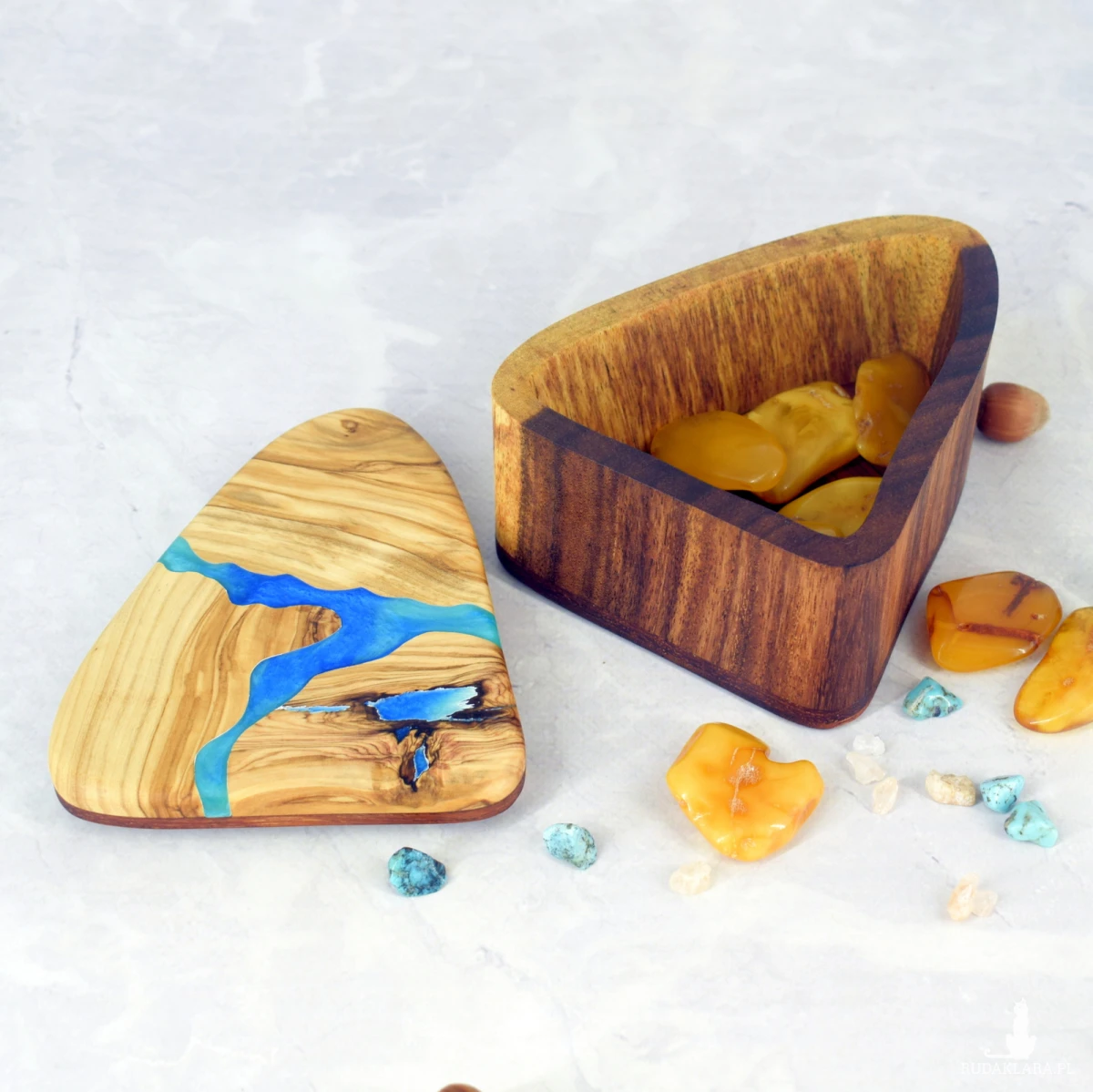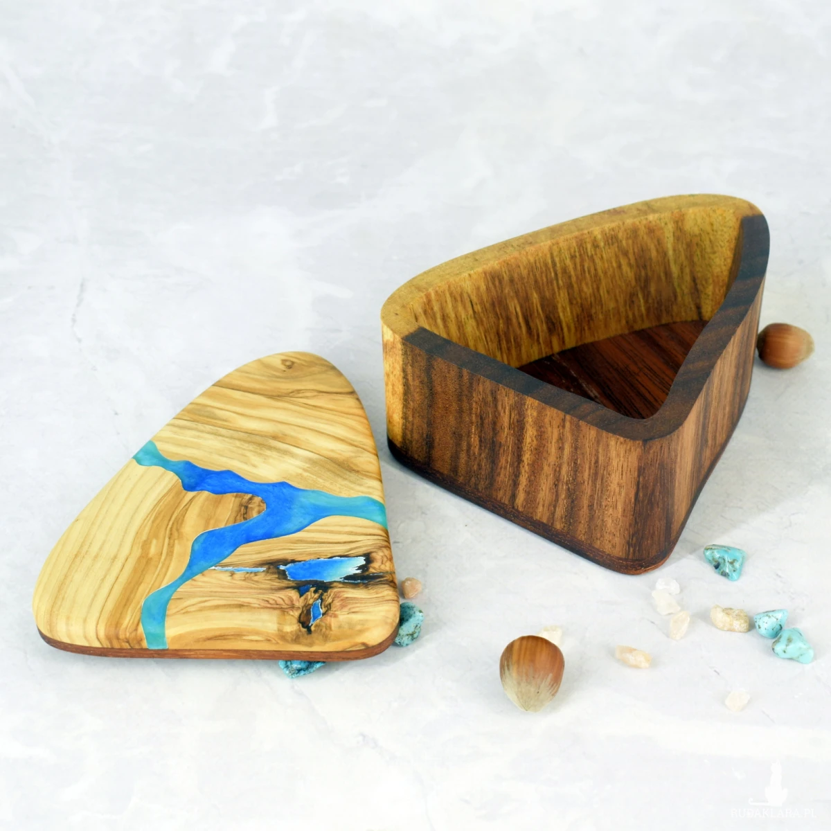 Ręcznie wykonana szkatułka z drewna oliwnego i suaru, ozdobiona akcentem z żywicy epoksydowej. Ciepłe odcienie miodu i karmelu pięknie kontrastują z połyskiem żywicy, tworząc elegancki i naturalny efekt.