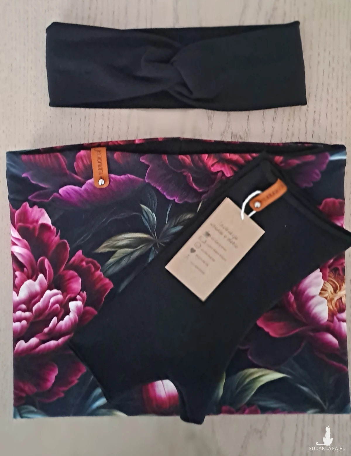 Ten piękny komplet jest uszyty z dresówki drapanej i wzorzystej dresówki pętelki. Komin na obwód 68cm i wysokość 52cm. Mitenki mają długość 28cm i obwód dłoni 18-19cm. Opaska ma wysokość 8,5cm oraz obwód 54-56cm.