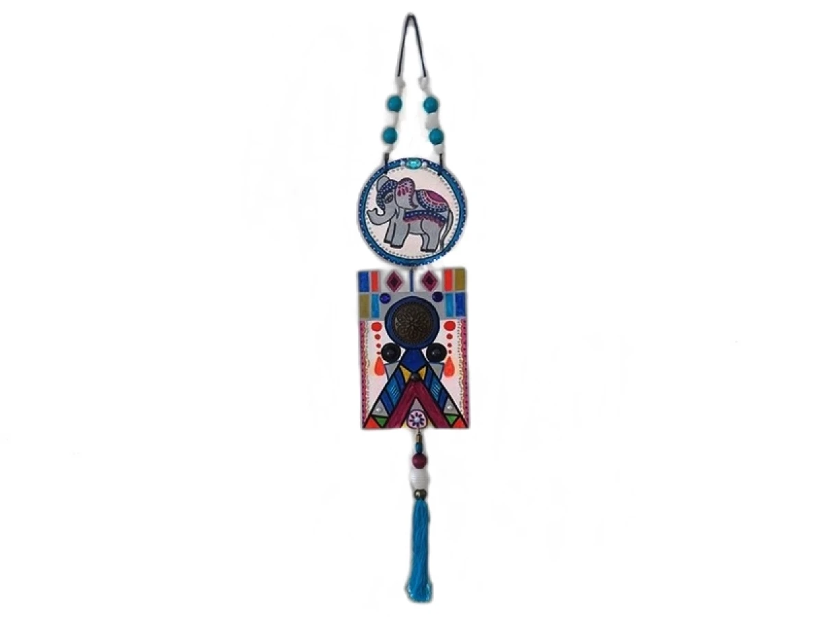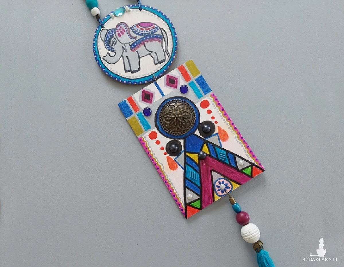 Ten przyciągający wzrok element dekoracyjny, inspirowany stylem orientalnym, przedstawia motyw słonia. Jest to jedyny egzemplarz. Wykonany z ręcznie malowanych elementów drewnianych, uzupełnionych drewnianymi koralikami i ozdobionych dekoracyjnymi aplikacjami jubilerskimi. Całość zdobi turkusowy chwost.