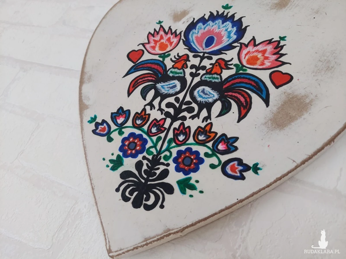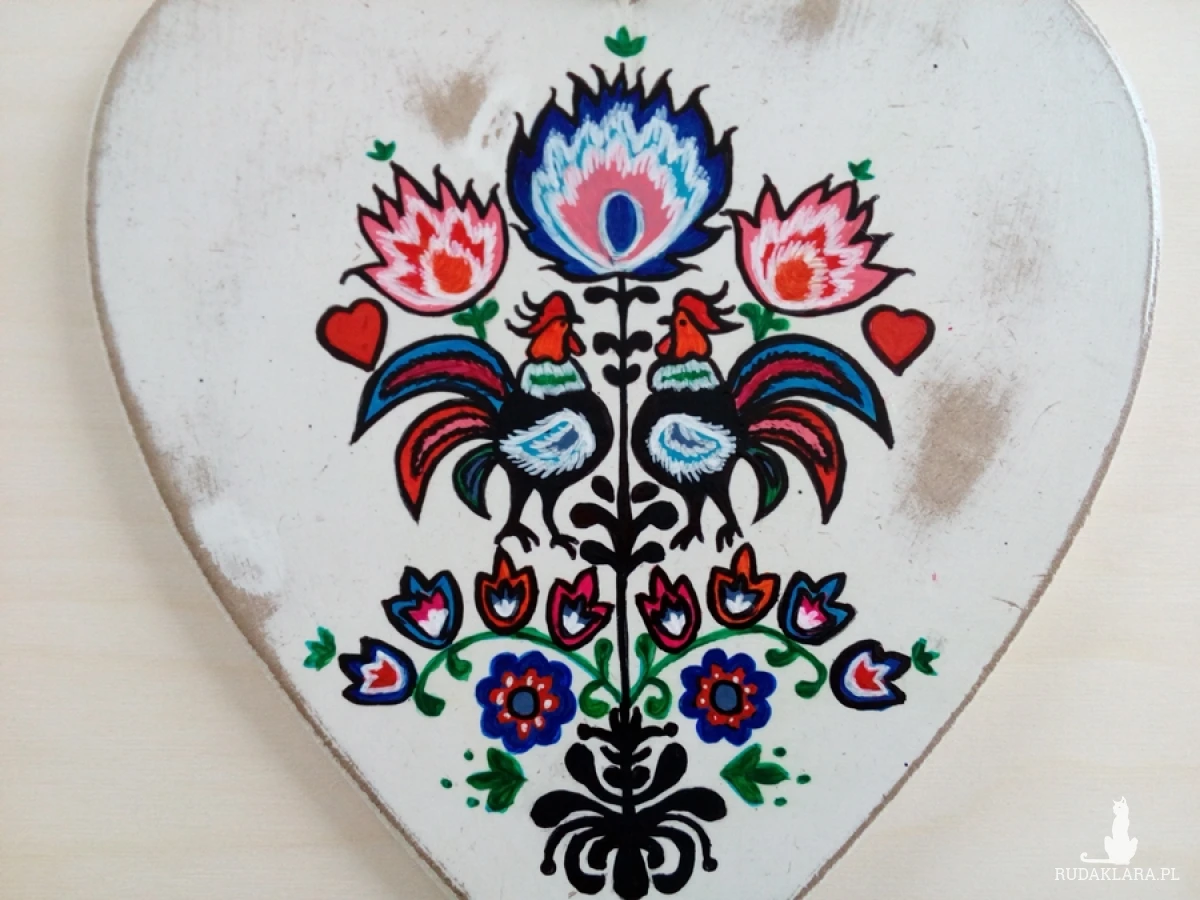 Duże, ręcznie malowane serce z motywem kogutów łowickich.