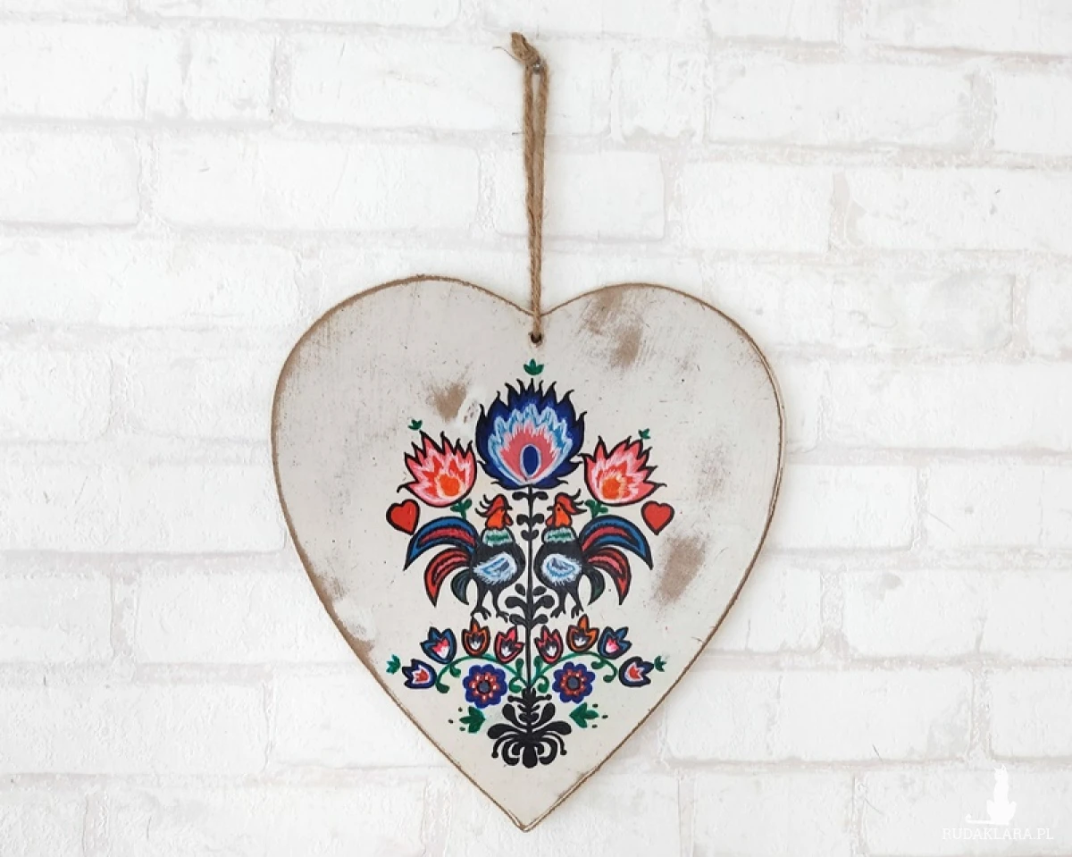 Ta dekoracja zachwyca wyjątkowym urokiem i barwnymi detalami. Jeśli kochasz kolory i chcesz wprowadzić do swojego wnętrza niepowtarzalny, ludowy akcent, to serce będzie idealnym wyborem.