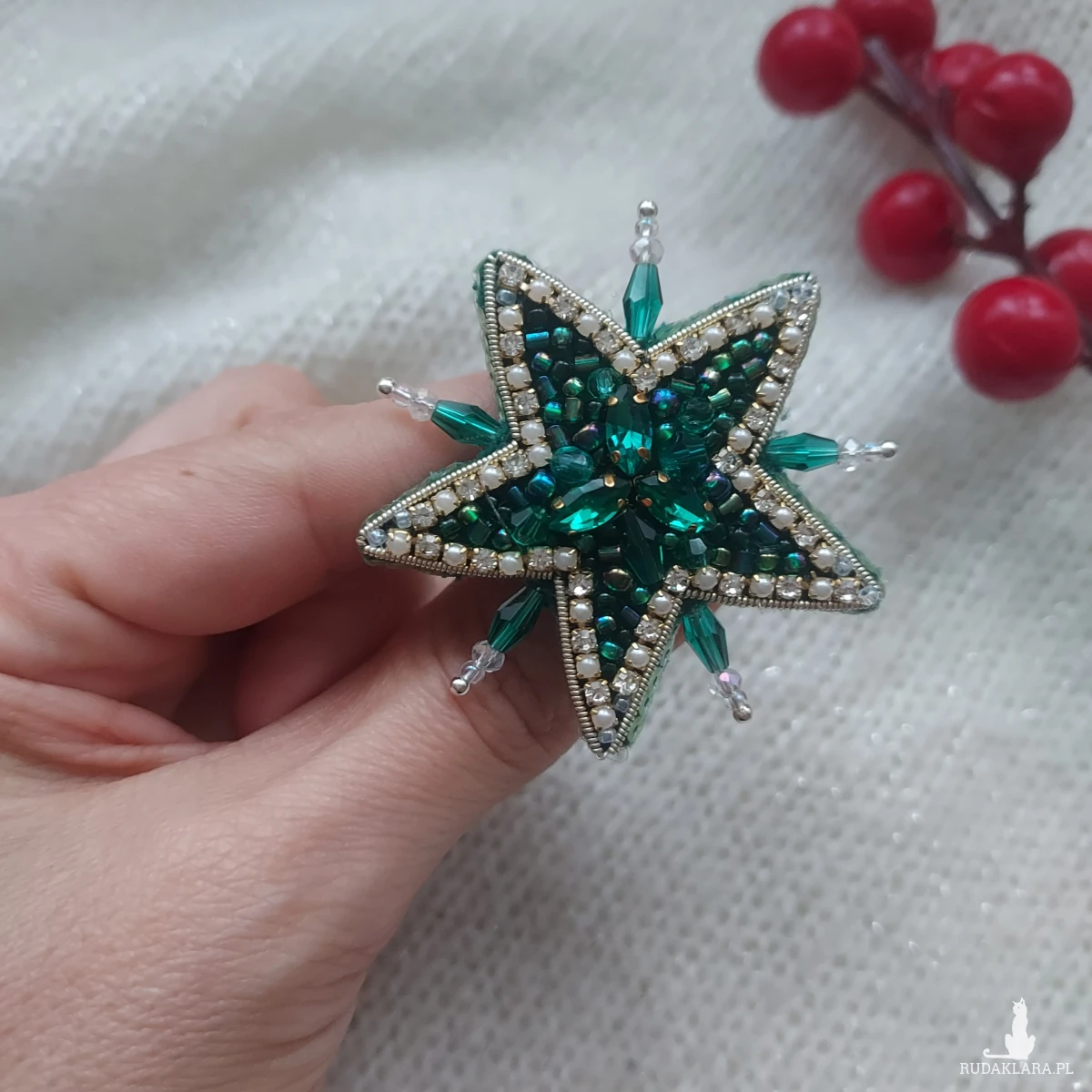 Broszka szmaragdowo-srebrna gwiazda - wykonana techniką haftu koralikowego. Zdobiona taśmą cyrkoniową doda niebanalnego wyrazu i blasku zarówno codziennym, jak i eleganckim, wieczorowym kreacjom.