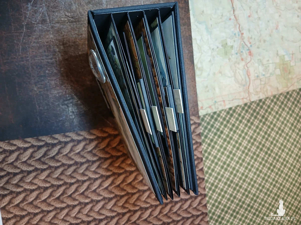 Album na zdjęcia o wym. 16x16 cm, obity czarnym płótnem, zamknięty sznurkiem z zawieszka. Album na 41 zdjęć o wym.9x13cm, maksymalnie na 46 zdjęć (są dodatkowe powierzchnie). W środku kieszenie, klapki, maty, belly band, wodospady, harmonijki. Ozdobne zapięcia i elementu 3d. Papiery od najlepszych producentów. Film z prezentacją albumu pod linkiem: https://youtu.be/21Dr-Pt-0b4?si=jH4I2LMya6mM5Va1