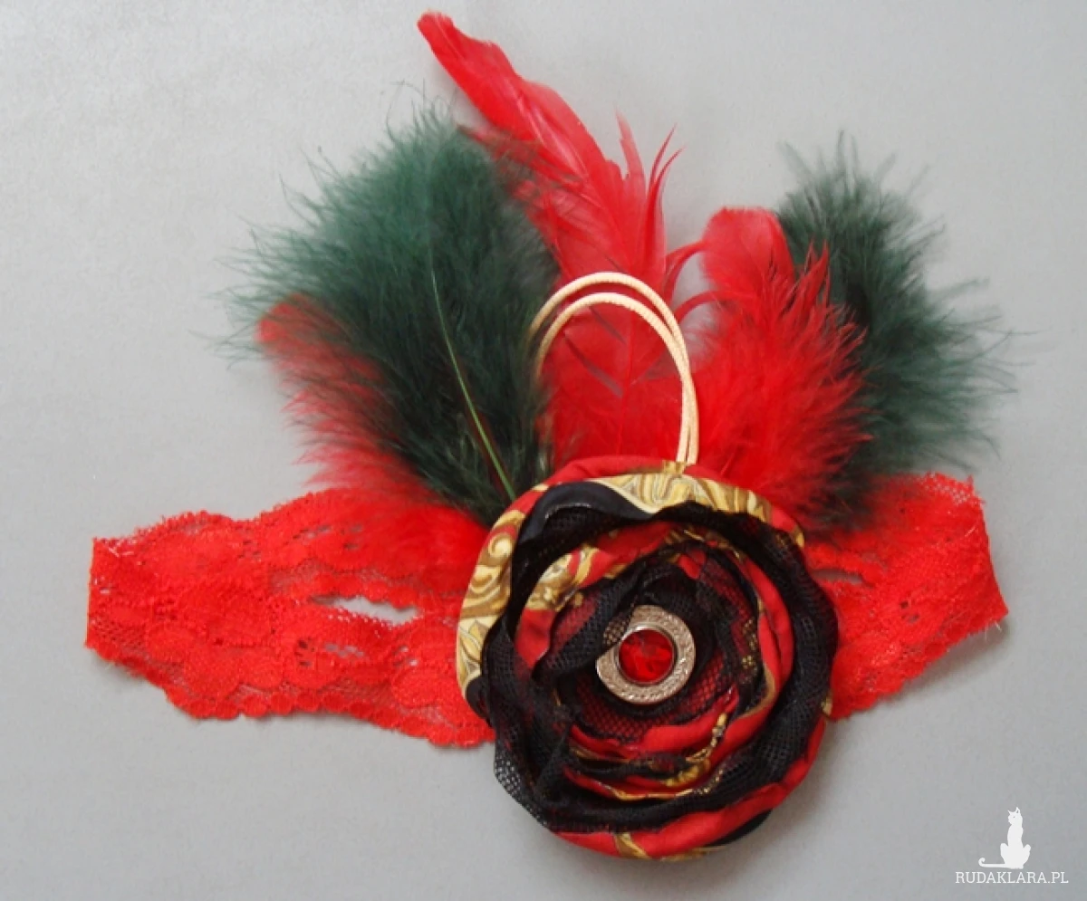 Czerwona opaska do włosów w stylu retro, z ręcznie wykonanym kwiatem uzupełnionym efektownymi piórami. Świetnie pasuje do stylizacji w stylu hiszpańskim, flamenco lub jako wyrazisty dodatek do wieczorowych kreacji.