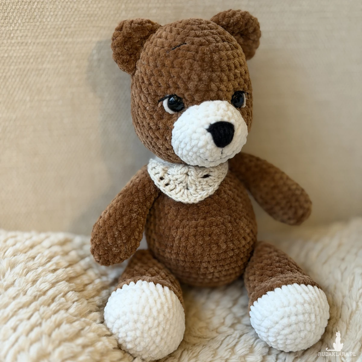 Uroczy miś wykonany ręcznie na szydełku z miękkiej, pluszowej włóczki w ciepłym brązowym kolorze. Apaszka również robiona na szydełku dodaje mu wyjątkowego, przytulnego charakteru. Idealny do przytulania oraz jako dekoracja pokoju.