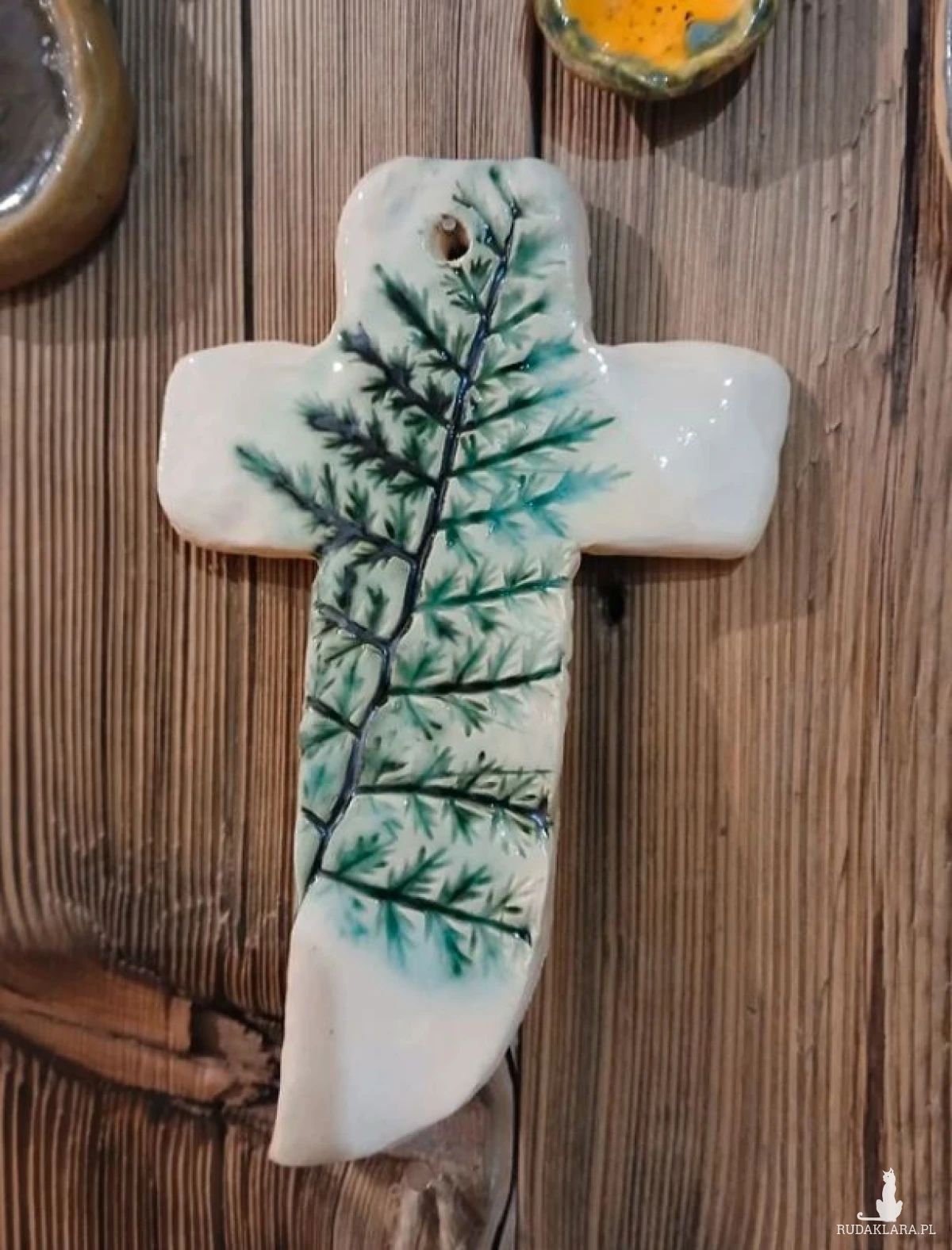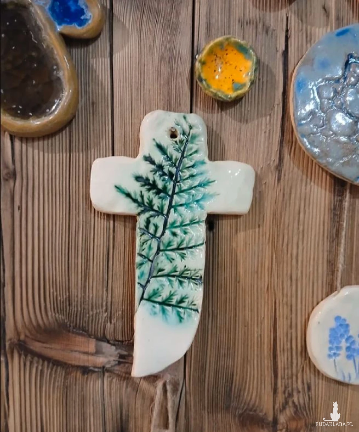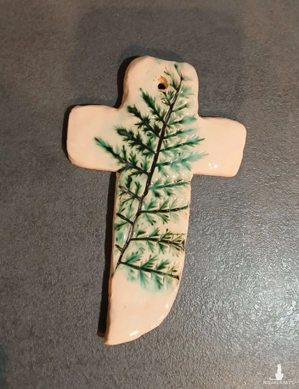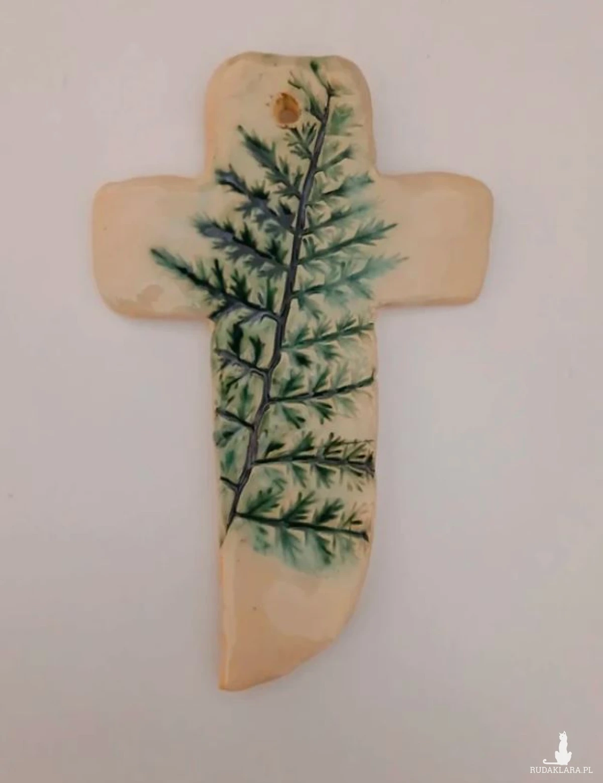 Ceramiczny krzyż gliniany krzyżyk do powieszenia na ścianie motyw roślinny paprotkaceramiczna zawieszka