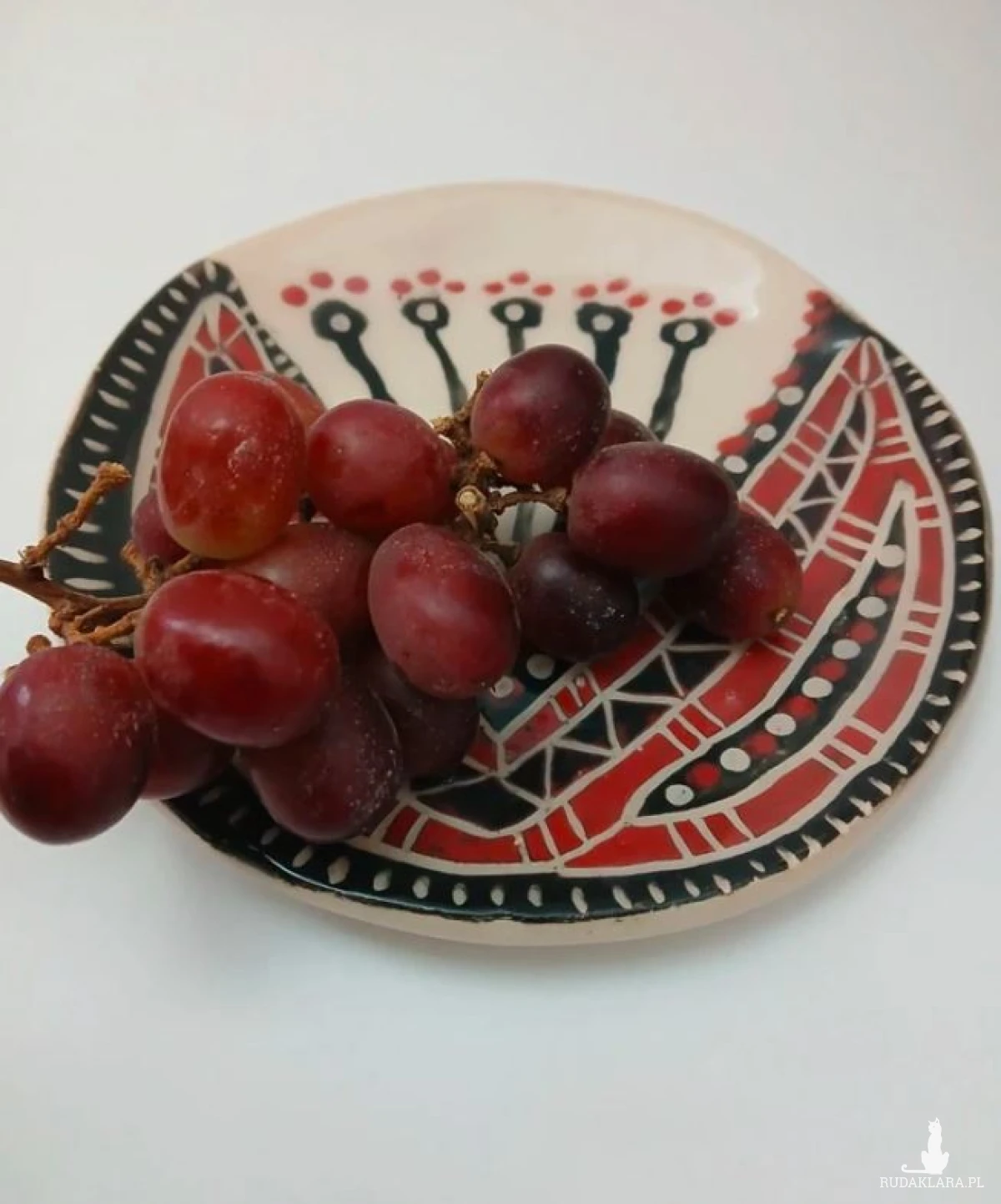 Ręcznie robiony talerz dekoracyjny świąteczny ozdobny talerzyk, podstawka, paterka średnica 16cm Talerzyk gliniany, ceramiczna podstawka, naczynie z gliny dekorowanej angobami metodą sgrafitto. Transparentne szkliwo. Można myć w zmywarce. Wypalany w piecu ceramicznym 1080°c Rustykalny folk folklor aztecki meksykański cottagecore