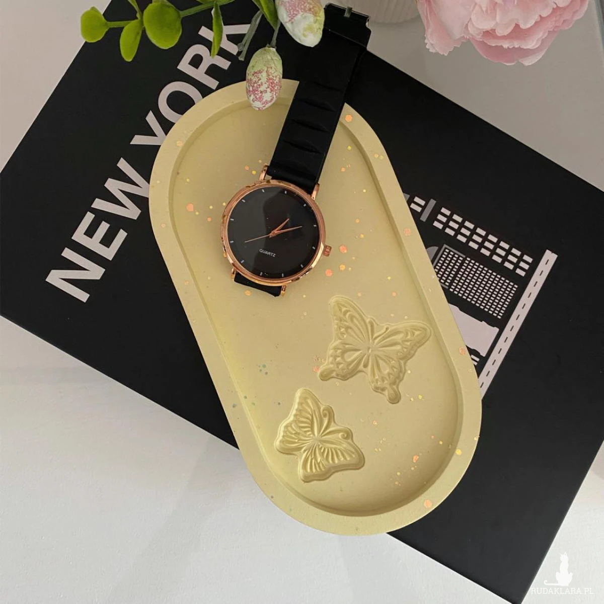 Taca dekoracyjna na biżuterię stworzona z wysokiej jakości ekologicznego gipsu polimerowego. Tłoczone elementy w kształcie motylków z dodatkiem połyskujących elementów dodadzą przytulności każdemu wnętrzu