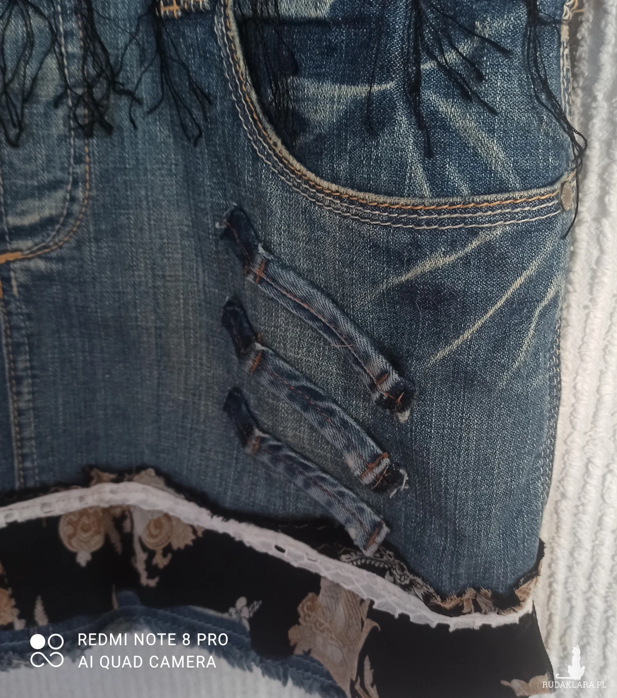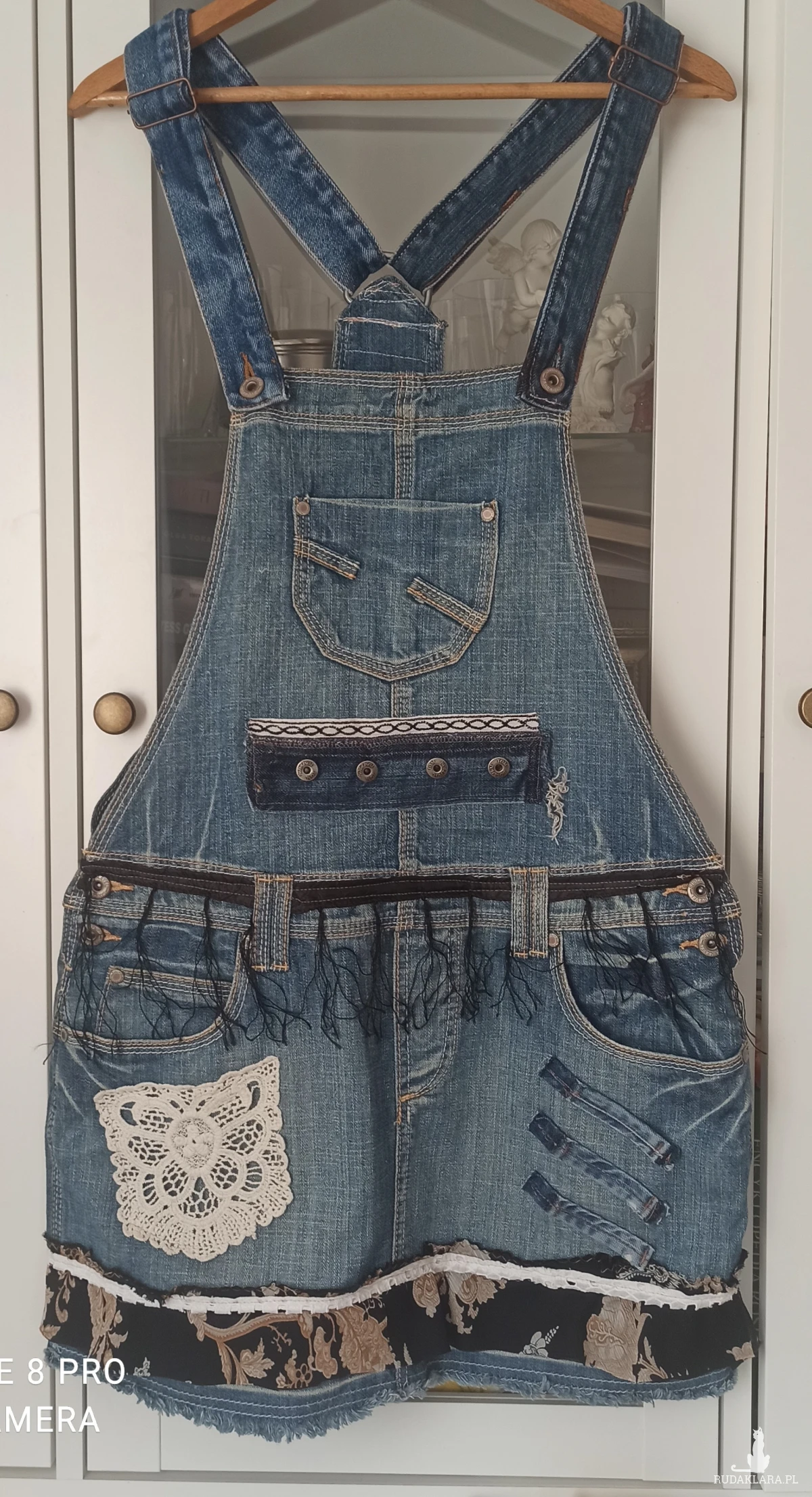 Oryginalna spódnica streetwear, moda rycyklingowa. Mini na szelkach,wykonana z niebieskiego denimu dla kobiet lubiących oryginalne i nietuzinkowe ubrania. Jedyna w swoim rodzaju, która przyciąga wzrok. U dołu falbanka z lekkiej żorżetowej kolorowej tkaniny w kwiaty przymocowana białą taśmą. Przód z czarnymi frędzlami w pasie, koronka i elementy denimu z guzikami. Z przodu 4 kieszenie, z tyłu dwie . Wszystkie kieszonki dekoracyjnie zdobione szwami. Zapinana na dwa guziki po obu stronach. Szelki regulowane, można dostosować do swoich wymagań. Elementy zdobień ręcznie wykonane, idealny dla osób, które lubią wyrażać swój styl. Dzięki takiemu zestawieniu spódni cmca tworzy odważny, a zarazem kobiecy look. Starannie wykonana spódnica, gotowa znaleźć się w Twojej garderobie. Jest lekka i wygodna. Denim pochodzi z recyklingu, dzięki czemu zyskuje nowe życie. Można prać.