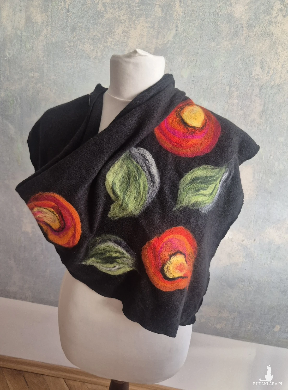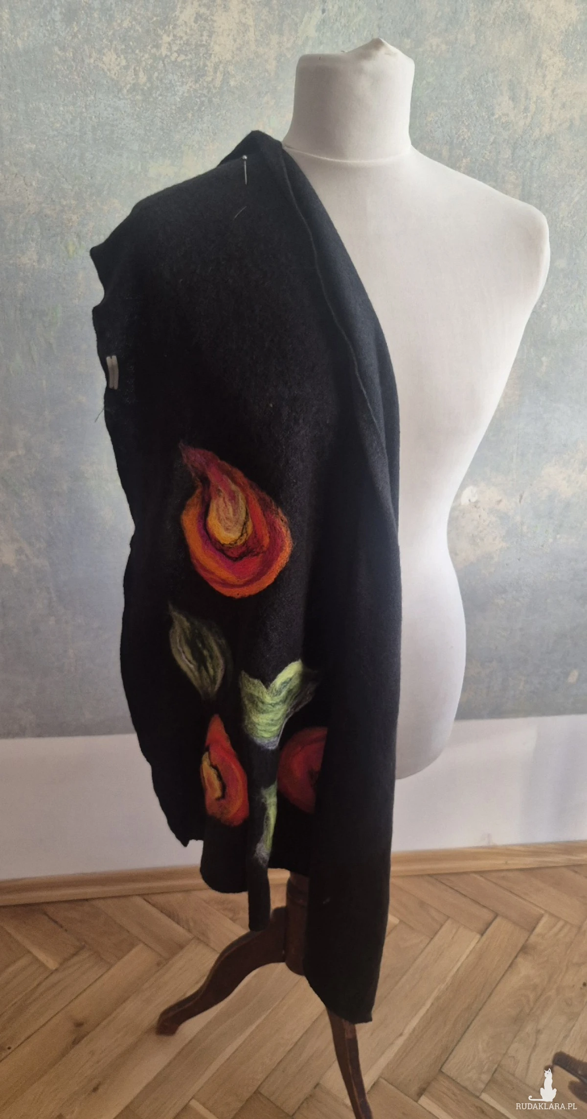 Czarna chusta handmade wełniana, elementy filcowane to wełna merynosów, produkt wysokiej jakości, chusta miła i ciepła, doskonała na chłodne dni, idealna na prezent, wspaniała na codzienne noszenie, zwraca uwagę swą oryginalnością, miękko układa się wokół szyi, absolutny bestseller polecam czas oczekiwania tydzien box 01