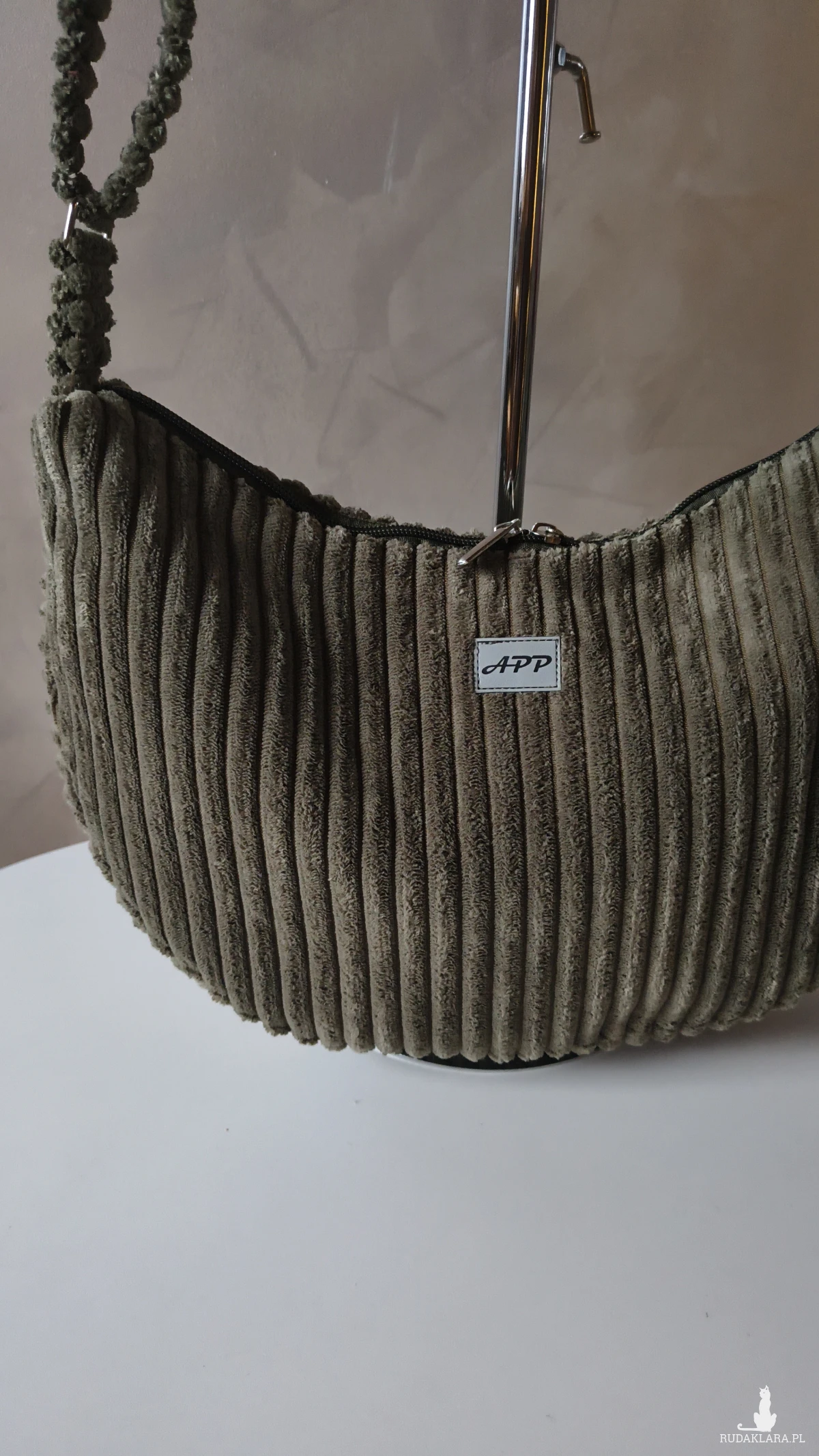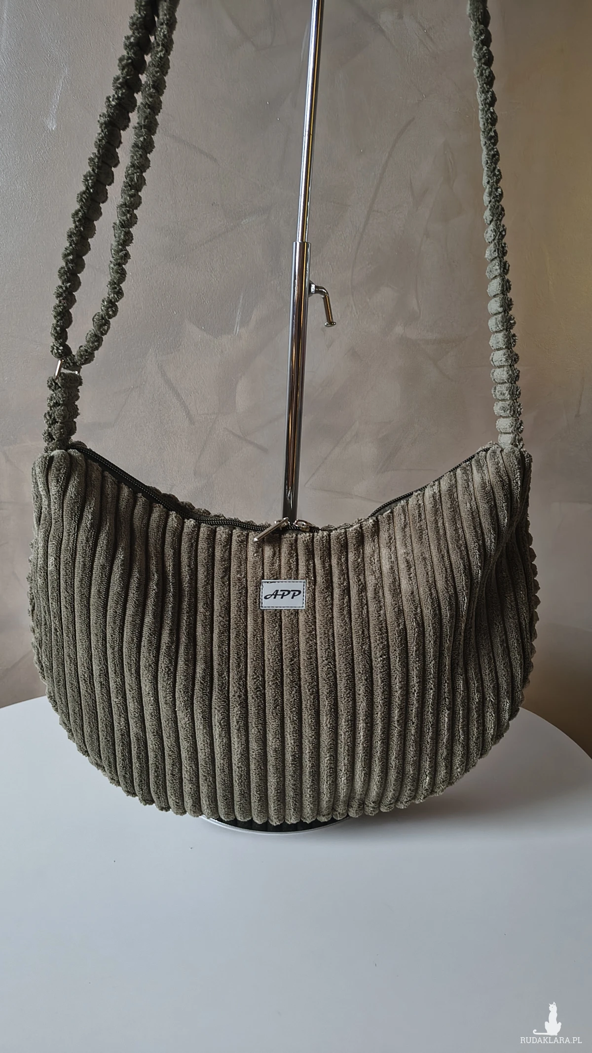 Powstała że sztruksu tapicerskiego, co gwarantuje jej wytrzymałość i długie użytkowanie. Wewnątrz znajduje się wodoodporna podszewka z kieszonką na zamek. Pasek regulowany również wykonany ze sztruksu, a więc delikatny dla naszego ciała. Torbę można nosić na ramieniu lub przez ramię. Okucia srebrne, niklowane.