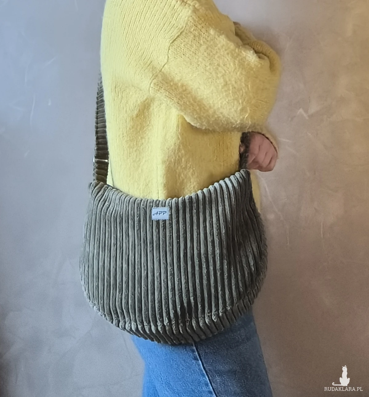 Sztruksowa, torba, która zachwyca już przy pierwszym dotyku. Jest miękka i przytulna, wygodna w noszeniu i na tyle pojemna, że zmieści wszystko, czego potrzebujesz na co dzień – od portfela i notes po 0.5 l. butelkę wody czy kosmetyczkę.