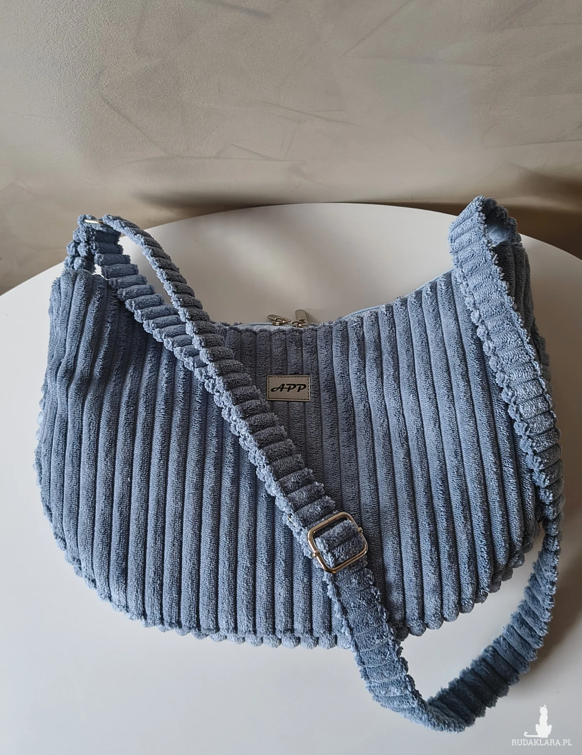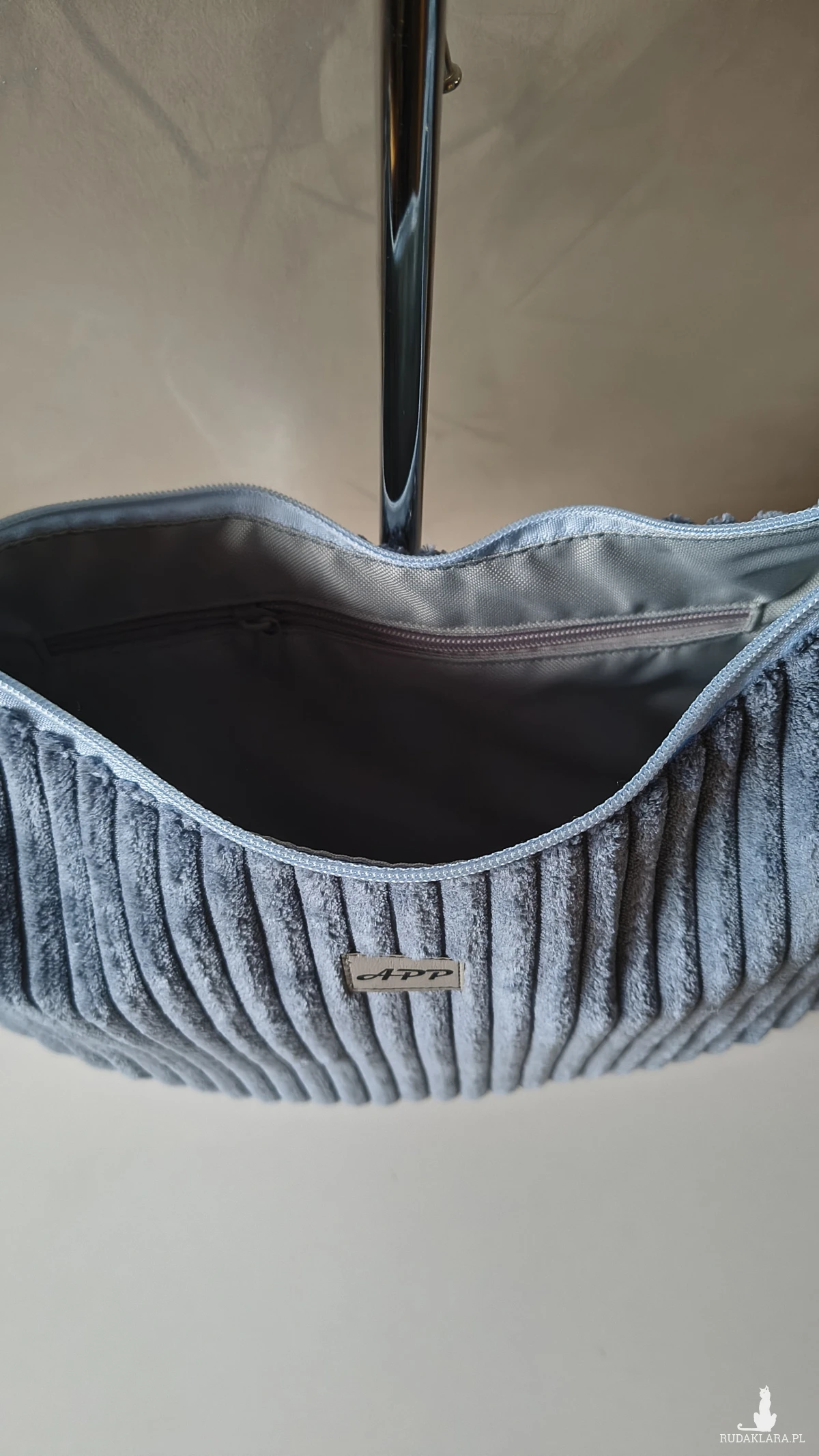 Powstała że sztruksu tapicerskiego, co gwarantuje jej wytrzymałość i długie użytkowanie. Wewnątrz znajduje się wodoodporna podszewka z kieszonką na zamek. Pasek regulowany również wykonany ze sztruksu, a więc delikatny dla naszego ciała. Torbę można nosić na ramieniu lub przez ramię. Okucia srebrne, niklowane.
