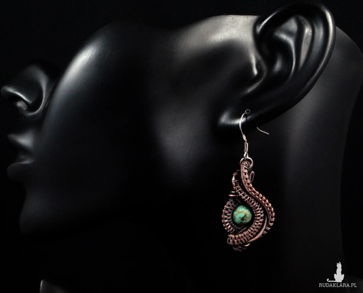 Miedziane, patynowane kolczyki z kuleczkami turkusu zielono niebieskiego.
