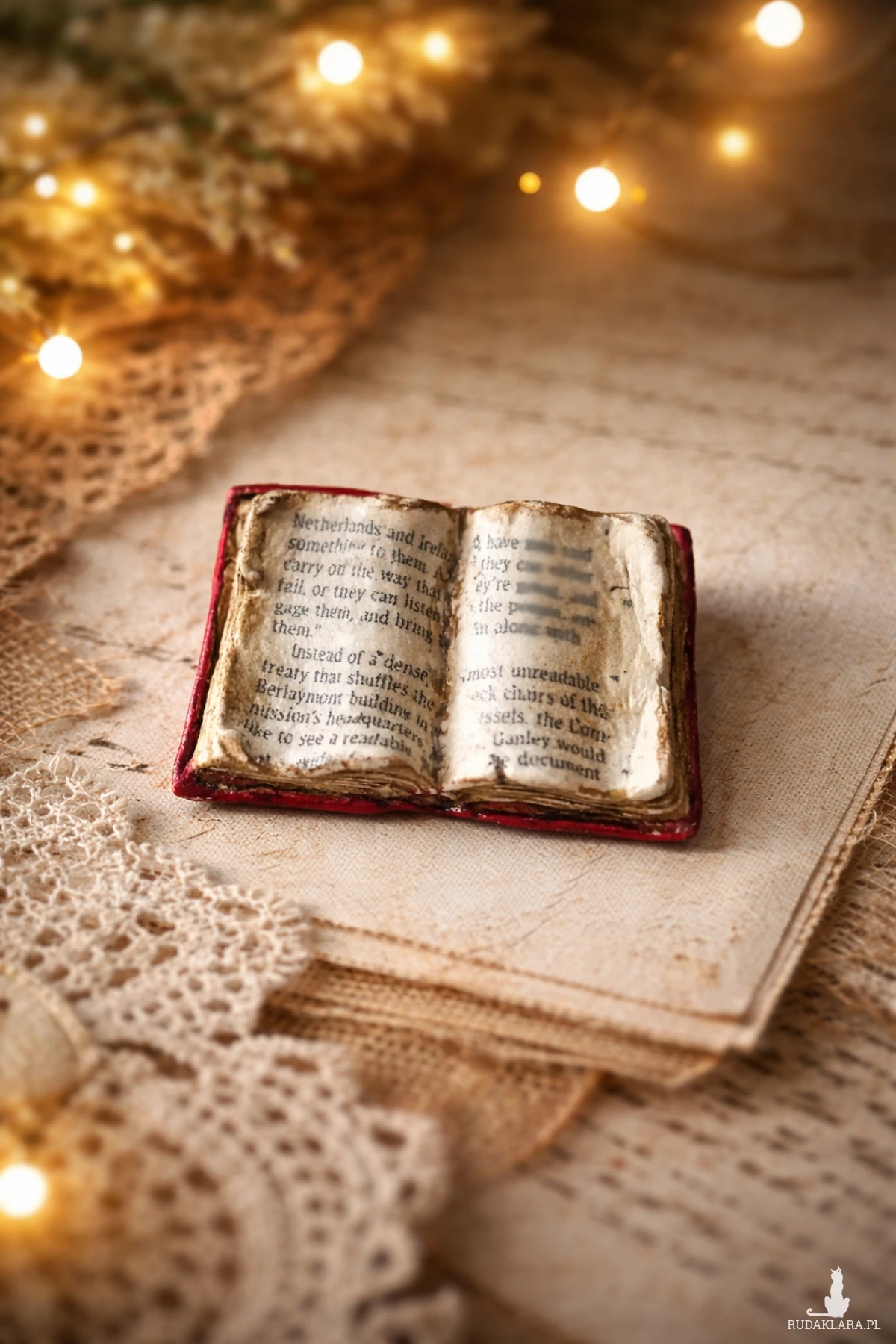 Oryginalna broszka - stara książka została ulepiona z gliny samoutwardzalnej, ozdobiona techniką decoupage. Dominujące kolory to beże, brązy, czerwienie. Broszka zabezpieczona lakierem.Wymiary: 5 cm/3,5 cm/1 cm.