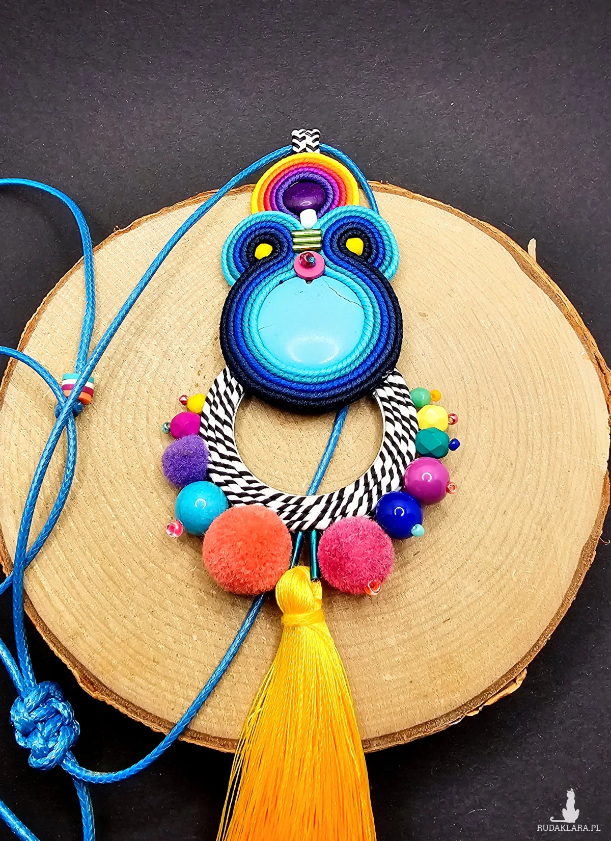 Kaboszony z kolorowych howlitów otoczone polskimi sznurkami sutasz oraz szklanymi czeskimi i japońskimi koralikami o różnych kształtach i wielkościach. Dół wisiora ozdobiony metalową bazą z czarno-białym sznurkiem oraz kolorowymi pomponami i szklanymi koralikami. Dół wisiora zakończony długim żółtym chwostem. Wisior zawieszony na turkusowym powlekanym sznurku z możliwością regulacji długości.