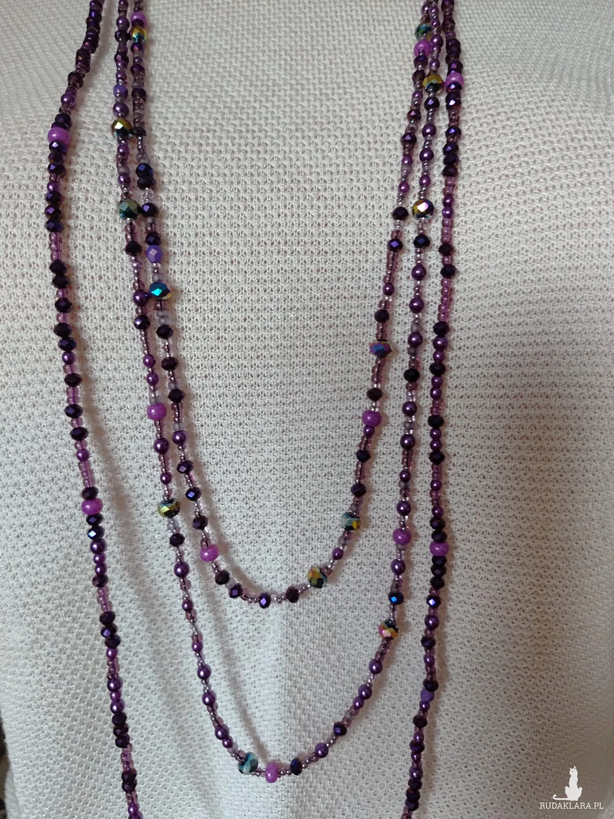 Trzy sznurki korali z perełek i kryształków w kolorze purpury. Bez zapięcia. Przekładane przez głowę co jest wygodne zwłaszcza dla osób starszych mających problem z małymi zapięciami. Długość sznura krótkiego 41 cm, sredni sznur 46 cm i najdłuższy sznur 54 cm Każdy sznur można nosić oddzielnie.