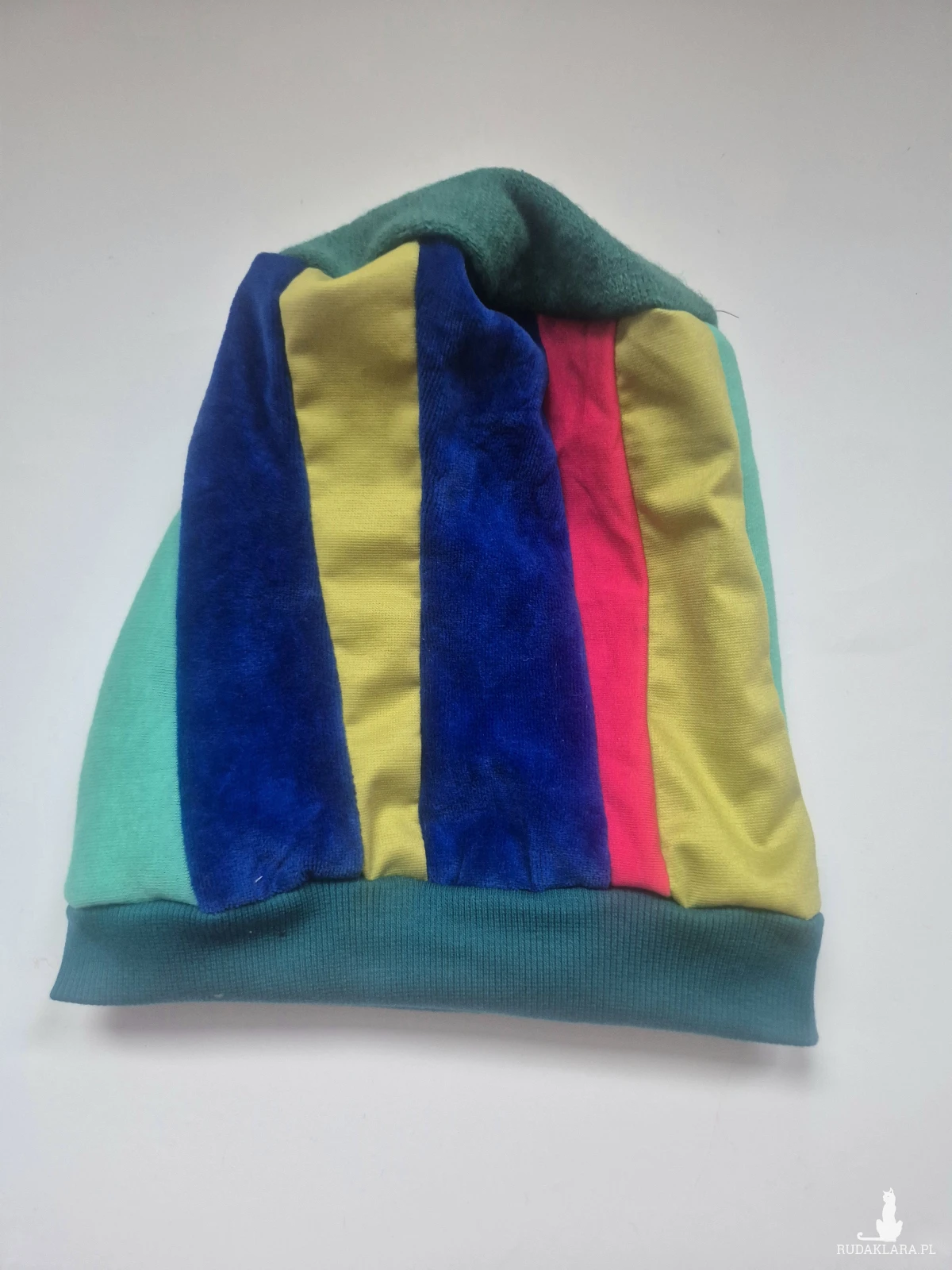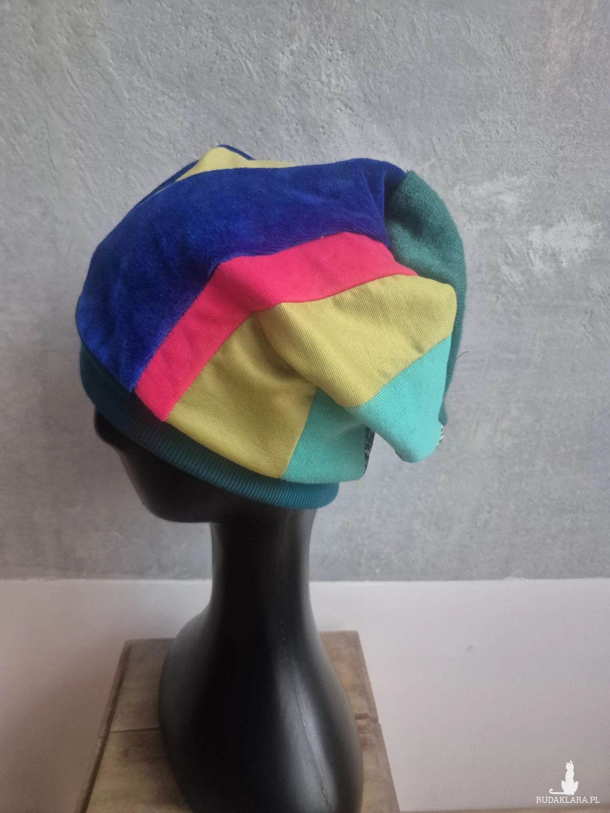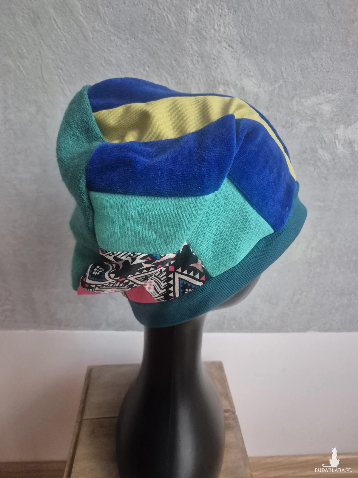 Czapka damska Smerfetka patchworkowa, na podszewce dobra na codzienne noszenie, wykonana w pojedynczym egzemplarzu rękodzieło polecam boks a1