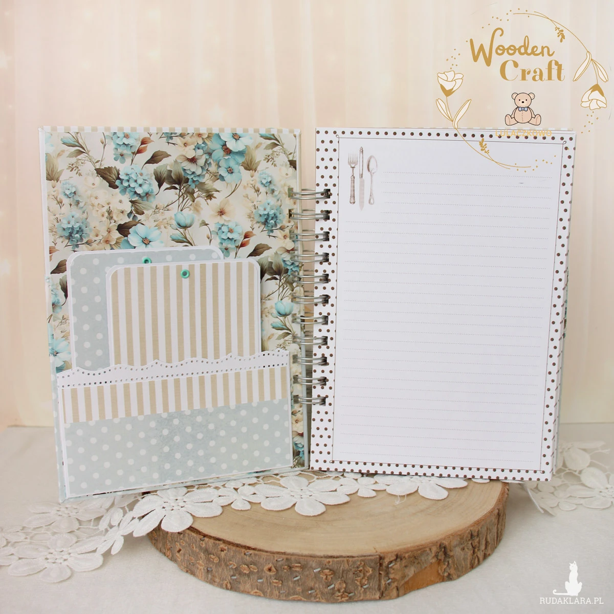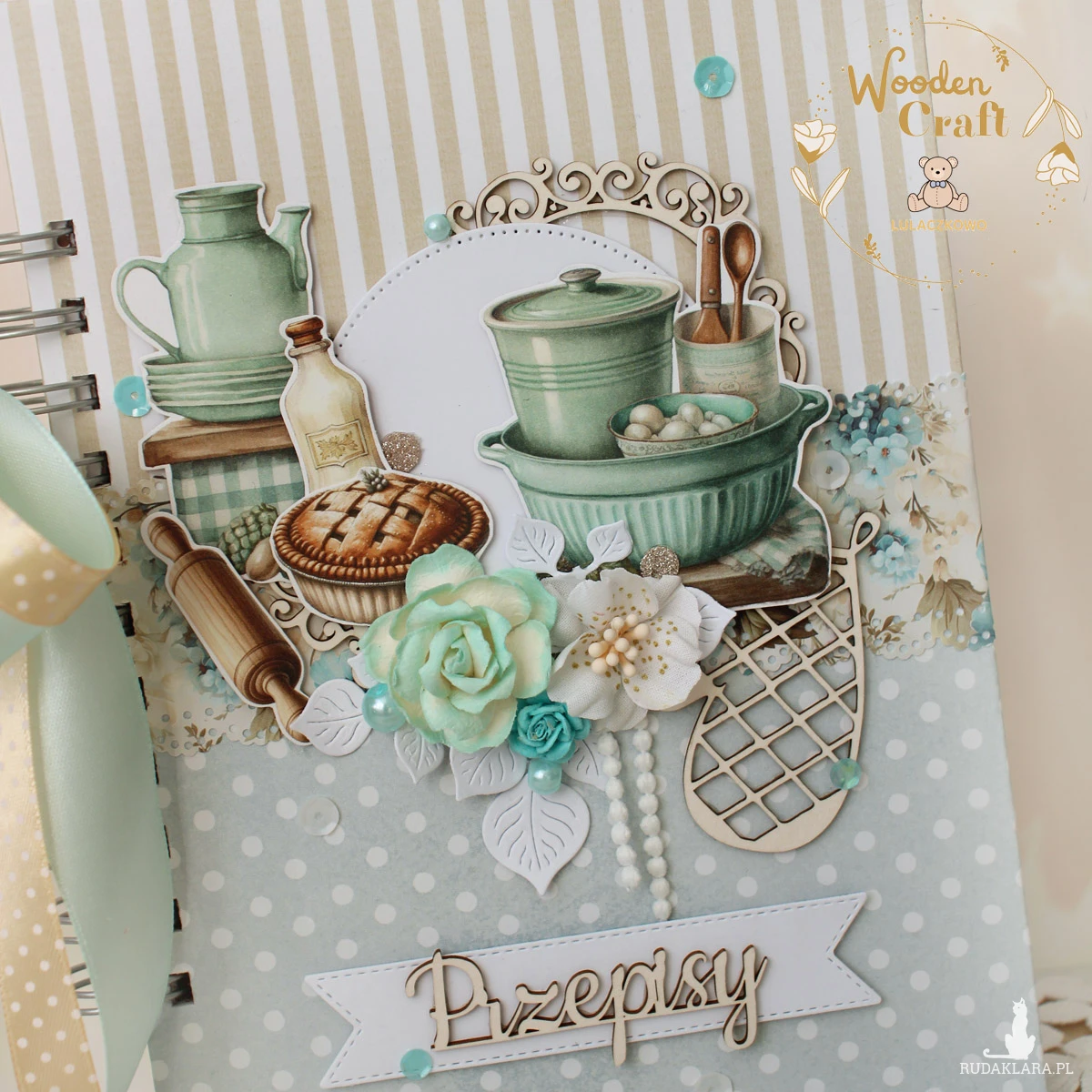 Piękny, ręcznie robiony przepiśnik, notes kulinarny wykonany metodą scrapbookingu z miksu kolekcji papierów. Okładka ozdobiona wycinankami z motywami naczyń kuchennych, ciasta wałka do ciasta, a także tekturką rękawicy kucharskiej. Na przodzie tekturkowy napis "Przepisy" - do napisu mogę dodać również imię. Przepiśnik ozdobiony miętowo-beżową kokardą.