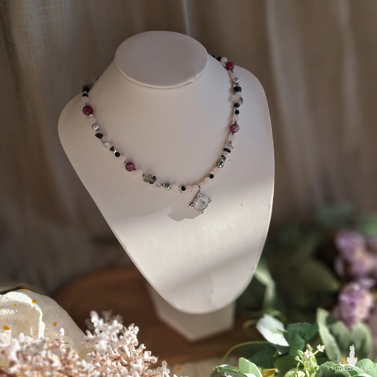 Naszyjnik ręcznie tworzony z kamieni i stali nierdzewnej (jubilerskiej). Użyte kamienie: