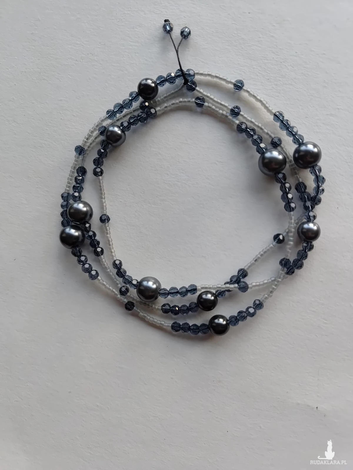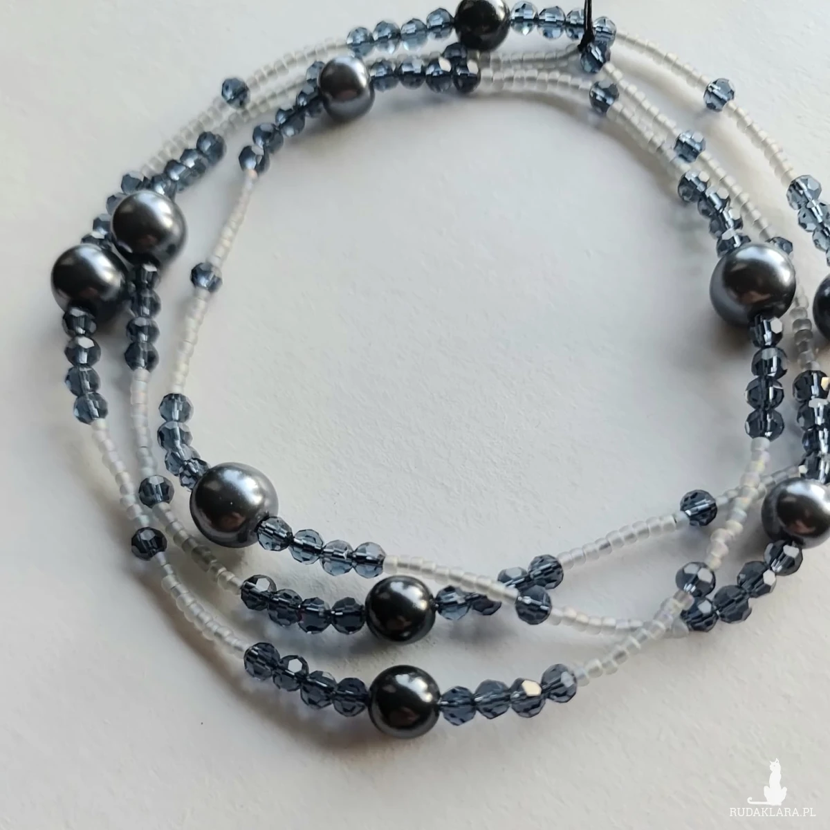 Długi sznur korali perłowych i kryształków szklanych. Perła grafit 6 i 10 mm, Sznur korali na sznurku syntetycznym. Wygodne zakładanie dla osób starszych przez głowę bez zapięcia. Długość sznura 40 cm